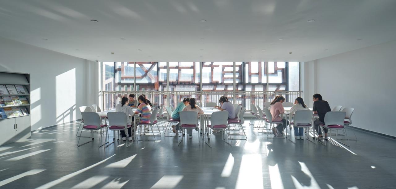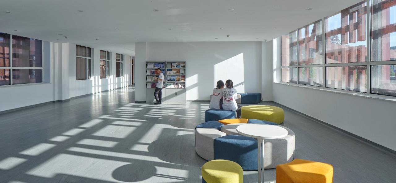 教学组团内部在室内空间“收与放”的节奏中,形成了多样的共享交流空间,实现了人文社交的可能性,为学生提供多样的互动沟通、协作分享空间。
