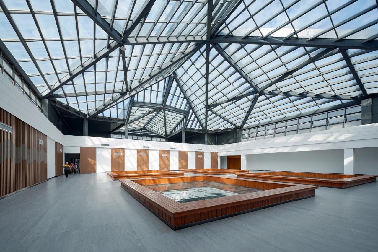采用被动式技术手段降低建筑能耗,综合楼顶部的多功能研学厅,结合结构斜交网格肌理设置采光屋顶和高侧窗,提高了研学厅的自然采光和通风效果。