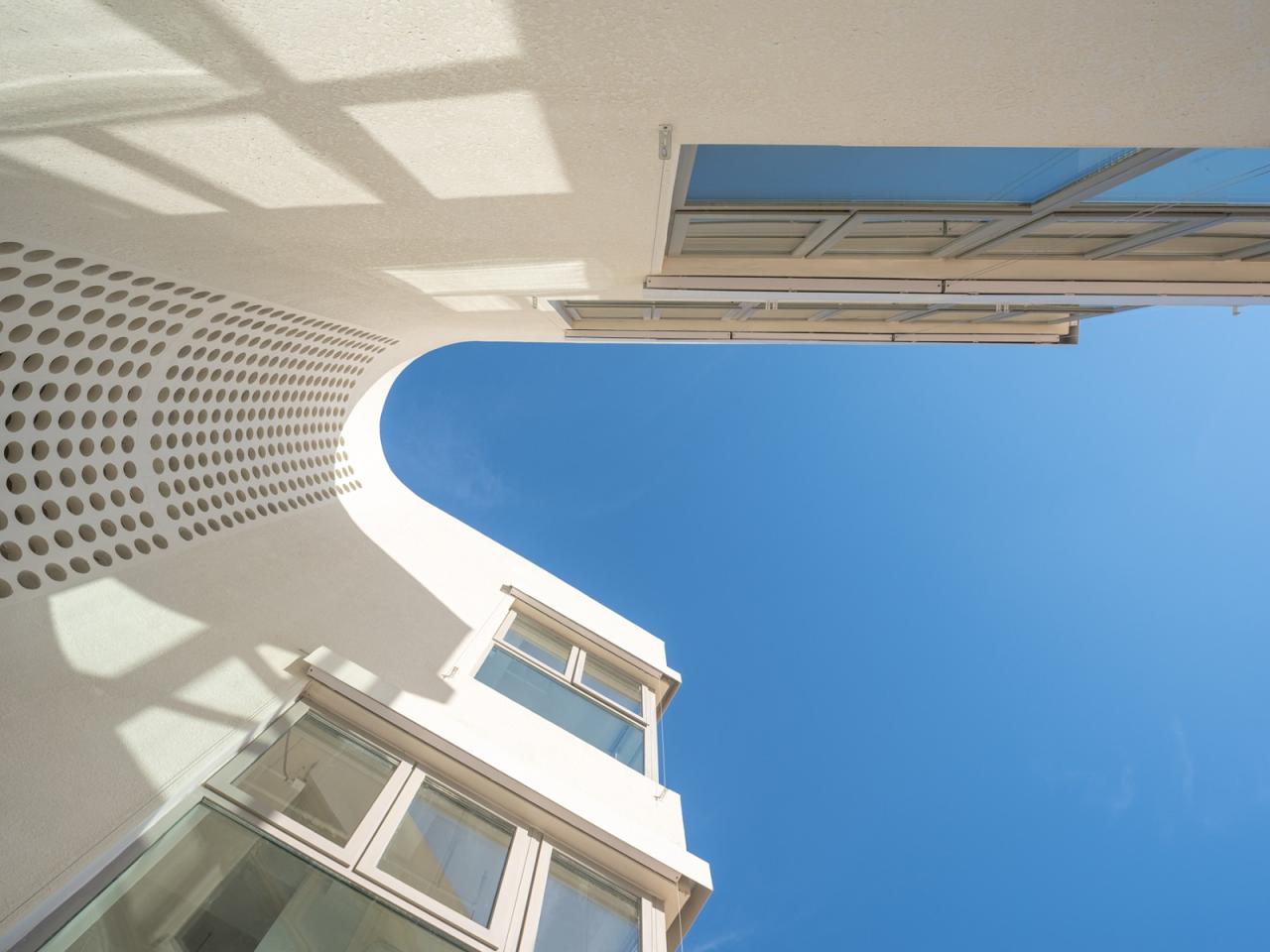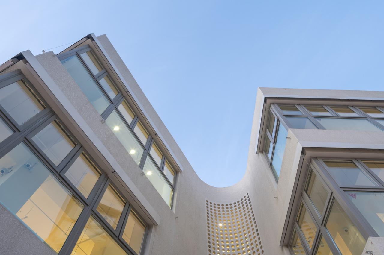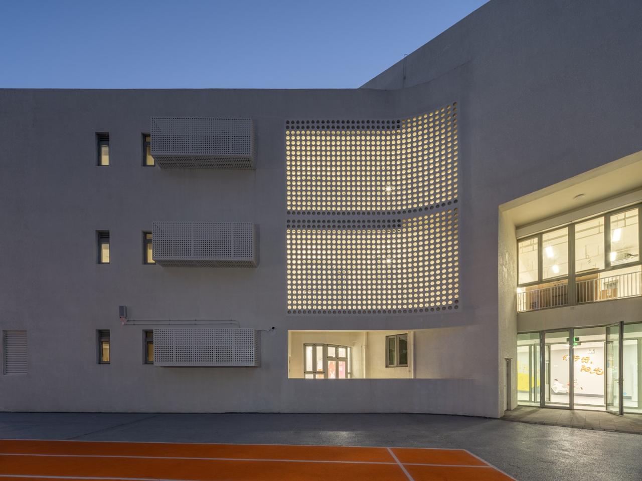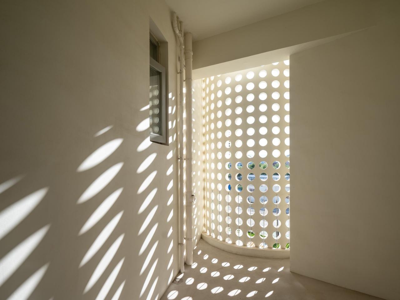 幼儿园的六个体块都由半室外的曲线阳台连接,阳台墙面采用了镂空的混凝土砌块,为室内带来丰富的光影变化。