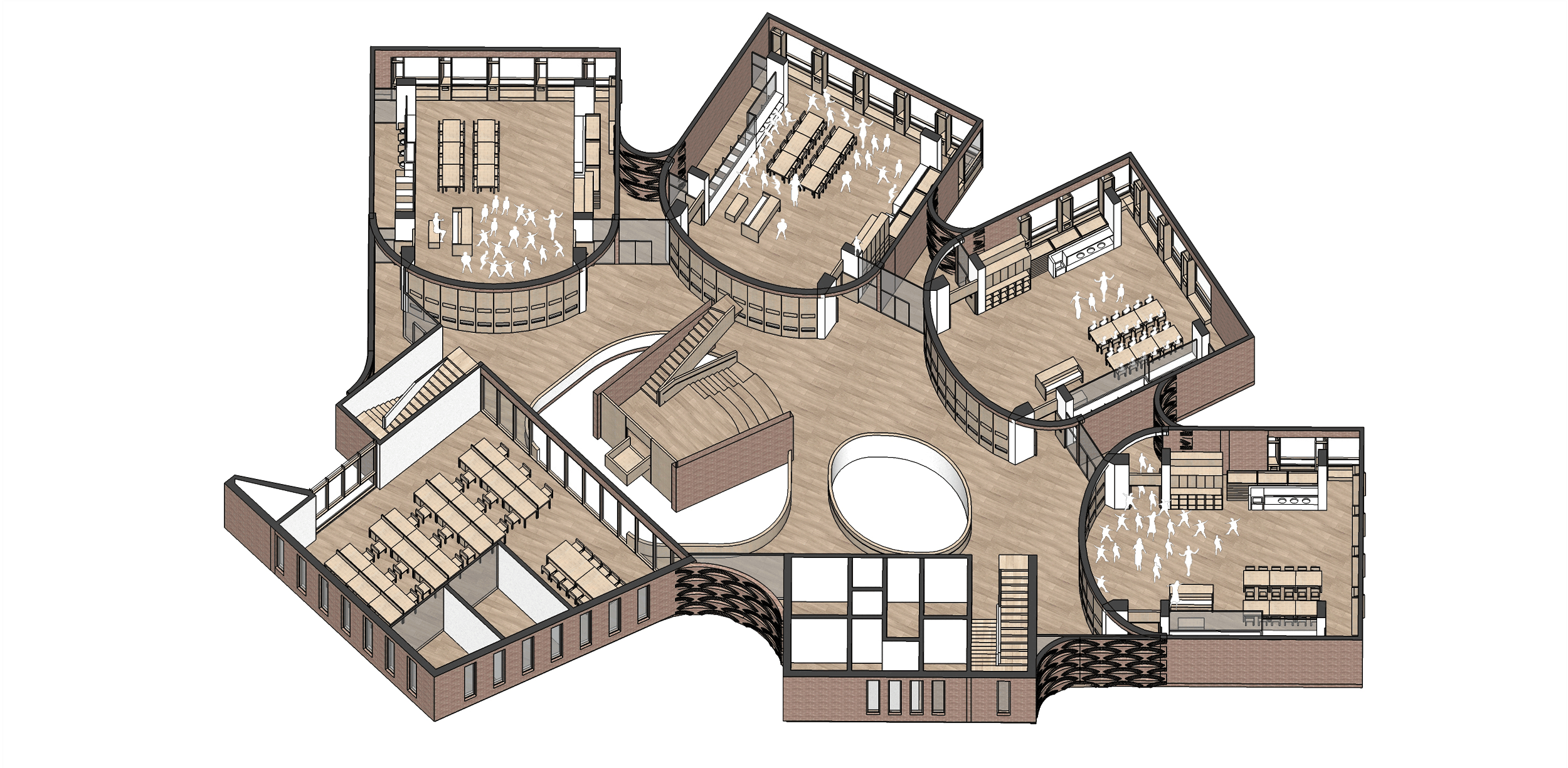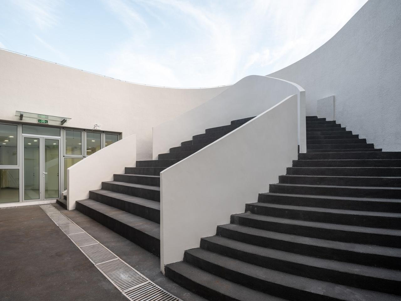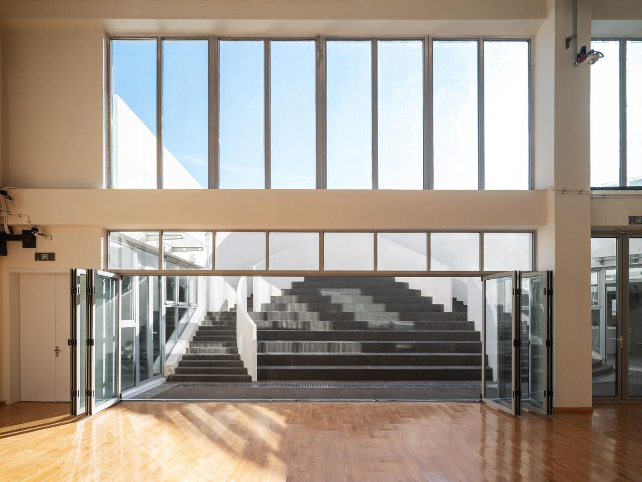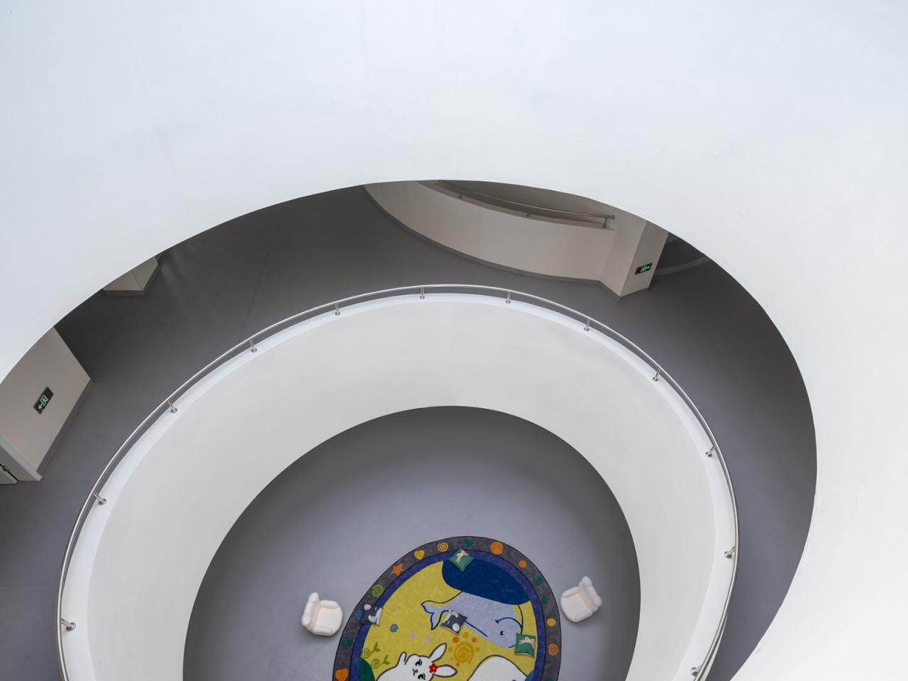 楼层中间的公共空间为可灵活使用的中庭,上方有天窗。多功能阶梯可以兼作小剧场。孩子们可以在这里聊天、玩耍、表演等等,与此同时发展他们的集体和社会意识。