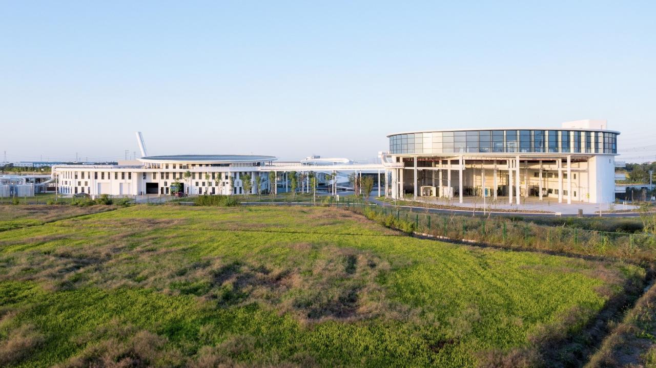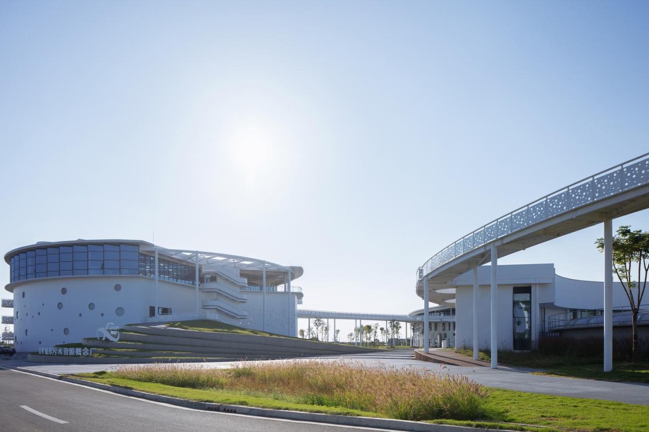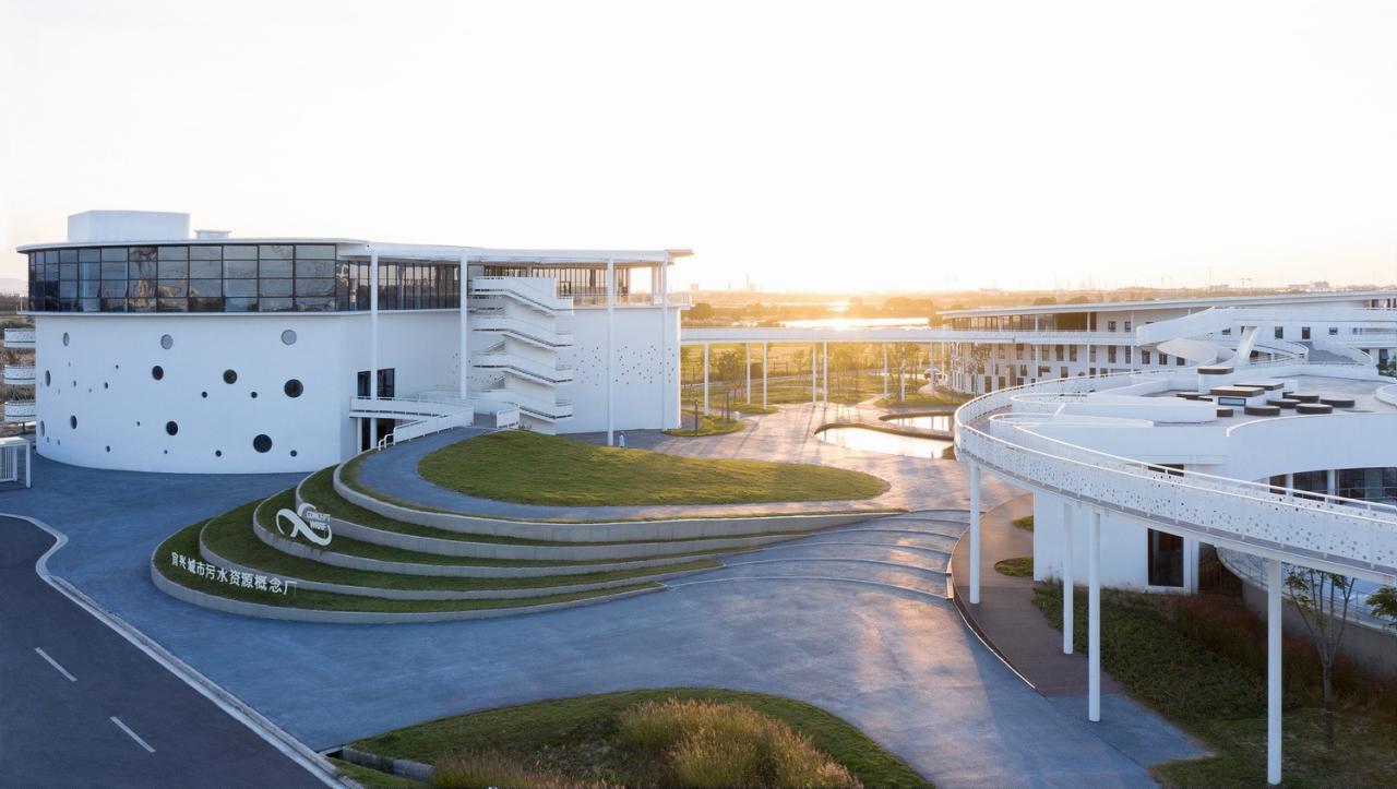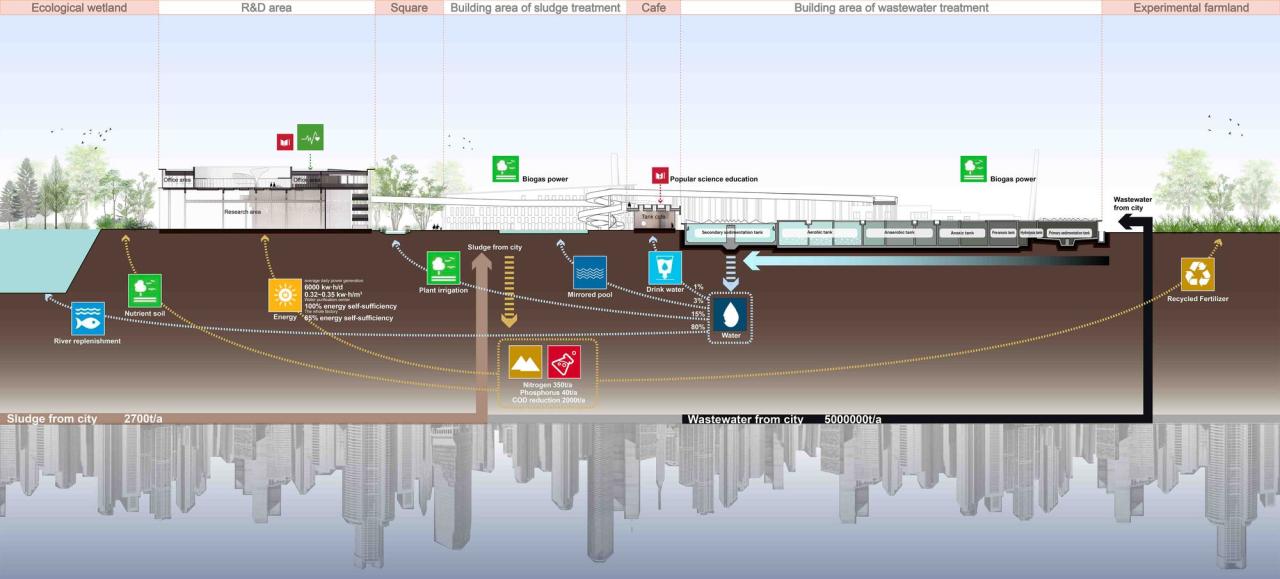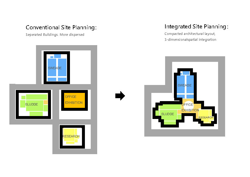 概念厂的整体建设包含污水处理( 处理量20,000t/ 日)、污泥与有机质处理中心(处理量100t/ 日)、科学管理中心(5234m2)、实验线中试区等内容。整体建构筑面积约33000m2,厂区的红线面积约8公顷。厂区规划注重如下四点:高效布局集约用地;变传统治废为资源循环工厂;景观建筑一体化设计;“环境、社会、人文”全方位的可持续。