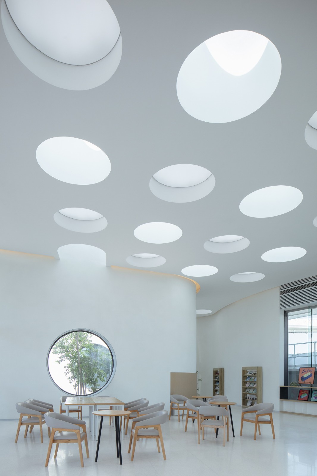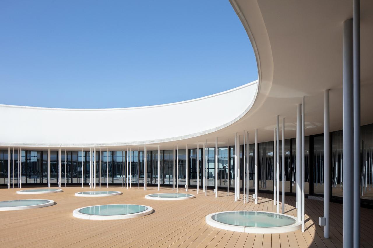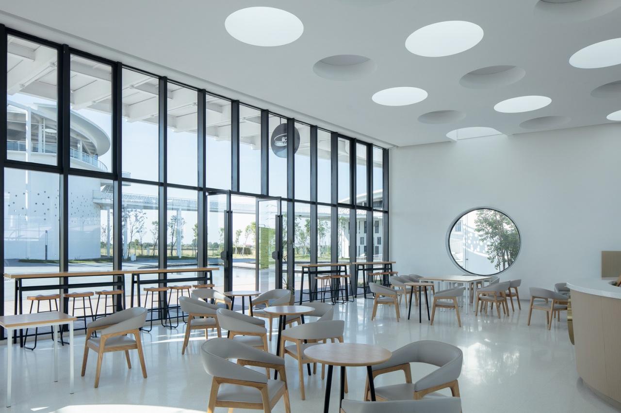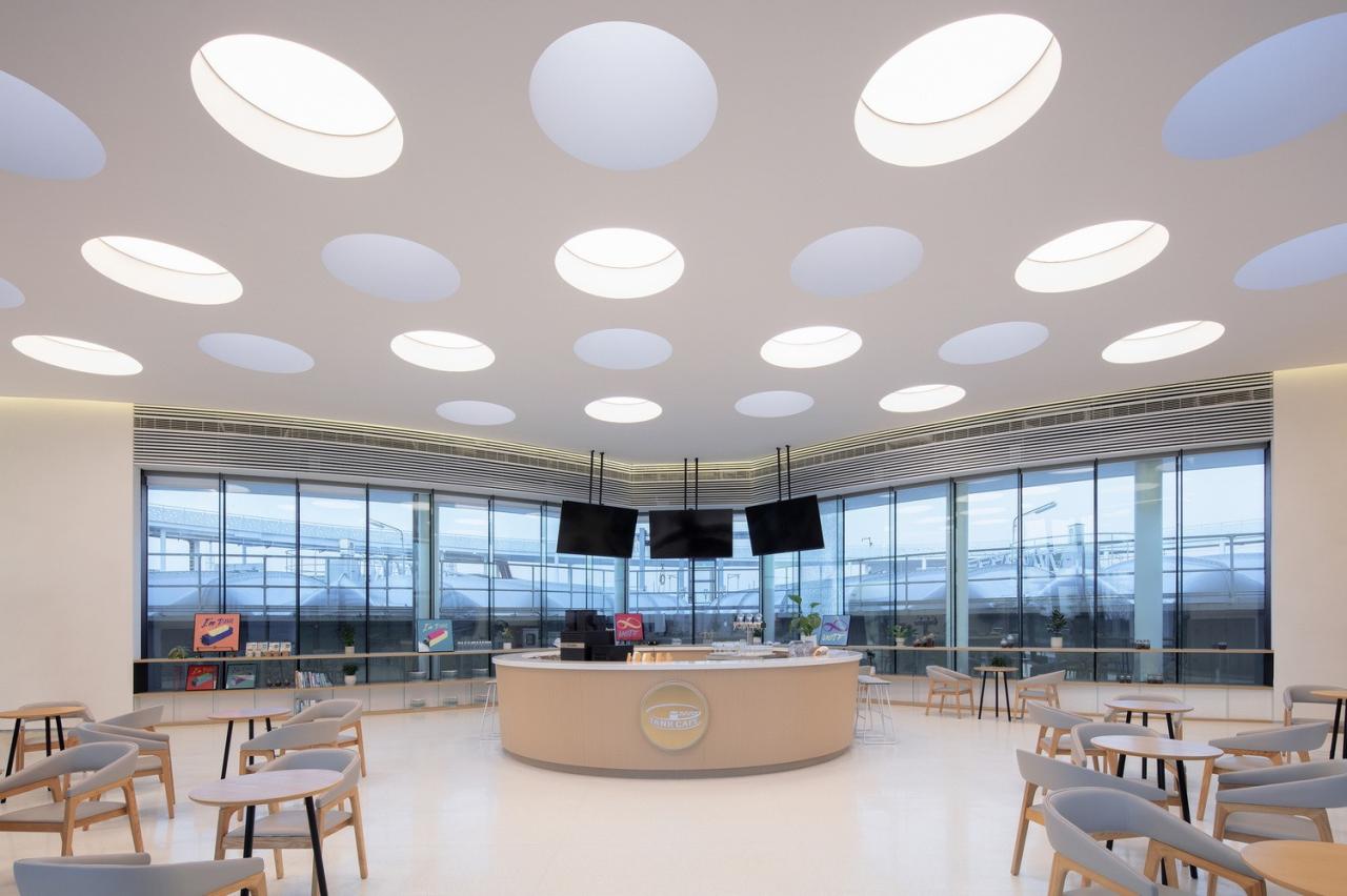 水区部分画龙点睛的处理是紧贴二沉池南侧的池子咖啡和中控展示厅这一线性序列空间。这部分不仅严丝合缝的与二沉池构筑物咬合,更是建筑,景观,室内,照明一体化的设计处理。咖啡区室内无柱的整体空间,配合不同时段的多功能布局,满足科普课堂,学术论坛,冷餐会等各种使用模式。