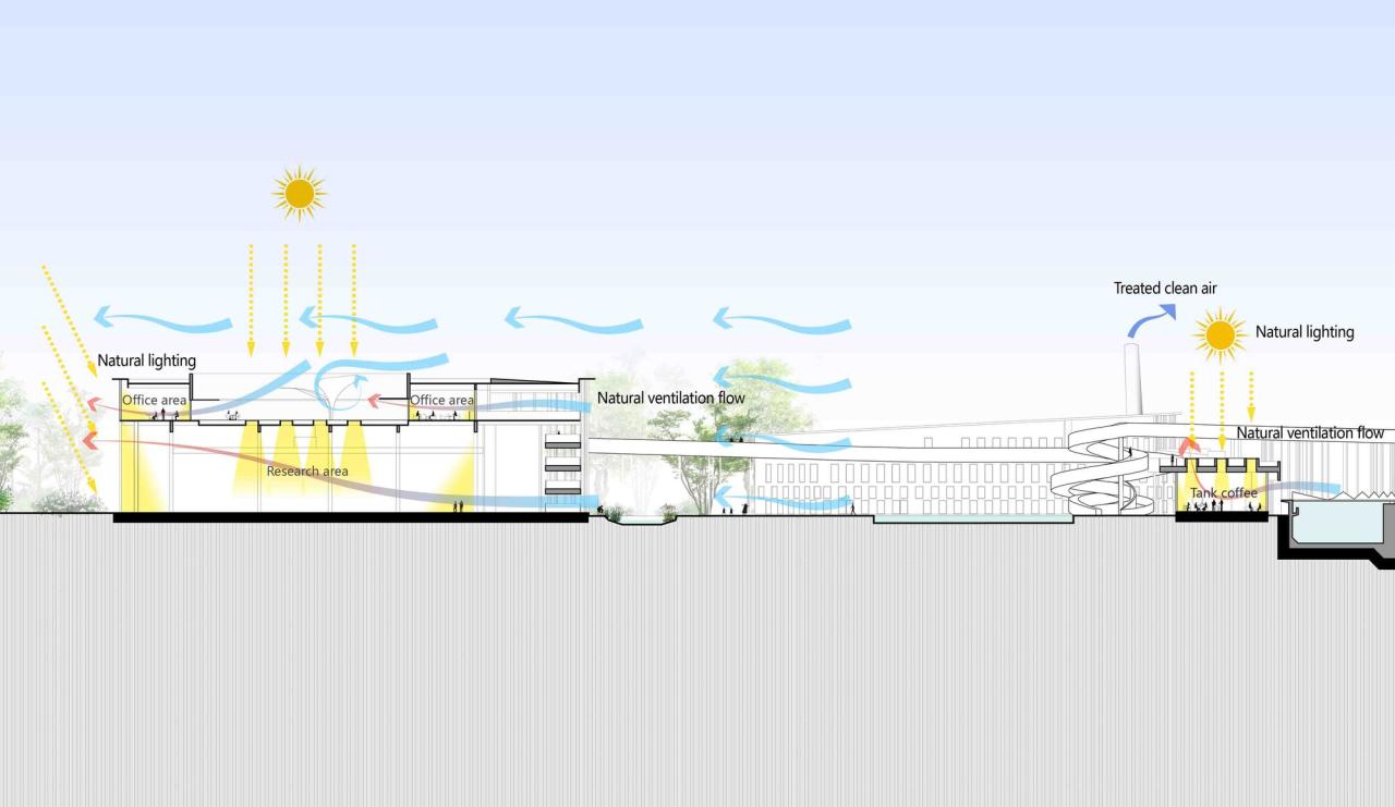 立体的参观动线, 自广场草坡而起,至广场水池双螺旋坡道而终,将办公研发区, 污水处理区,有机质处理区这三大功能板块环绕成一片抽象的“三叶草”。公众的参观与厂区的日常运行和维护界面立体分流, 在保证不影响厂区内的安全生产与正常运营的前提下,让公众可近距离参观了解各类处理工艺。这一立体参观动线和公共广场的设立,加深了公众对概念厂的了解, 增强了公众与工厂之间的互动:户外广场,草坡,景观水池可以办音乐节,文化周,户外婚礼,更多的参与开放的公众生活。