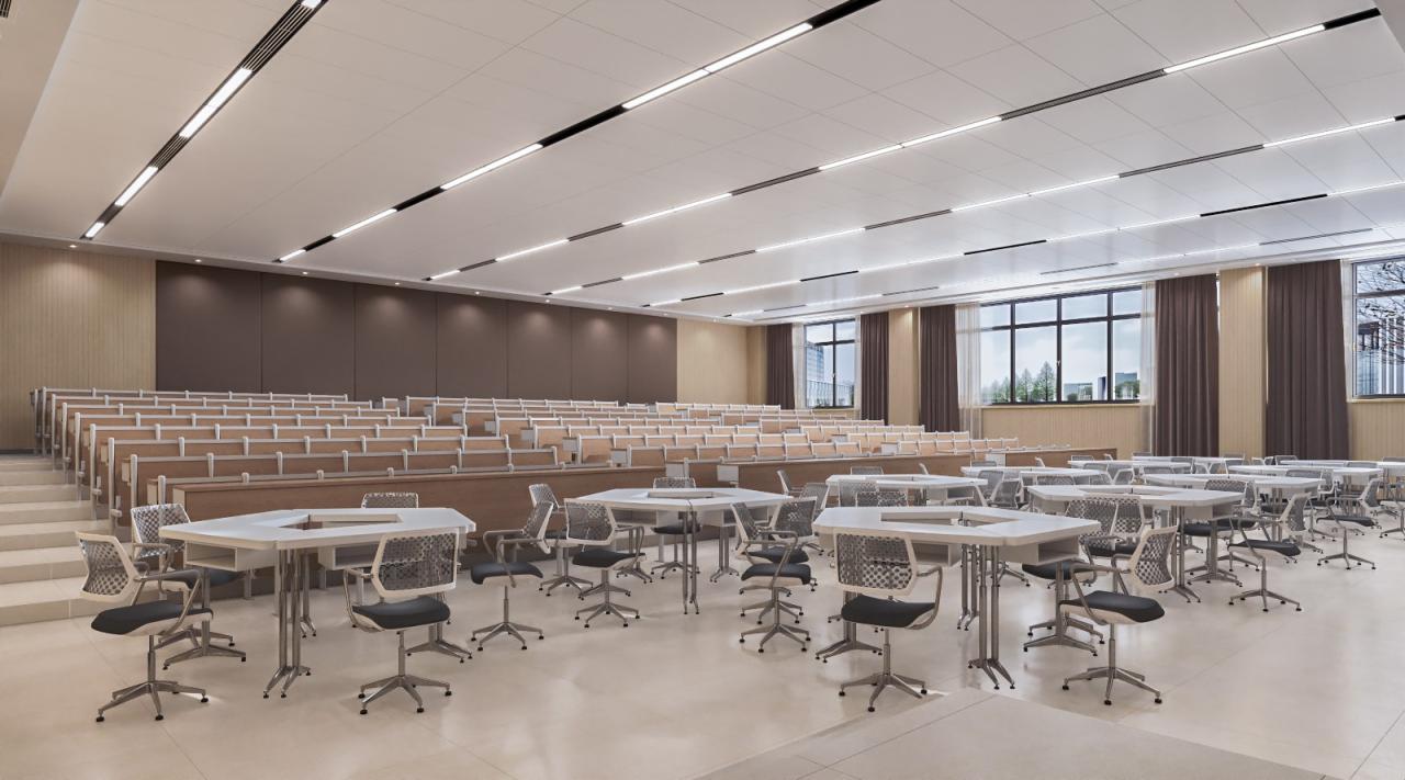 家具和设施的设计以实用和安全为首要考量,环保材料、适当的软包及圆弧的收口设计,以确保学生的安全。教室空间的灵活性和多功能性,为老师和学生提供多样化的使用场景,方便实施不同形式的教学和学习活动。教室布局考虑学生的交流与合作,营造一种创造开放、温馨的学习氛围,鼓励学生的互动和合作,以促进学生身心健康和全面发展。