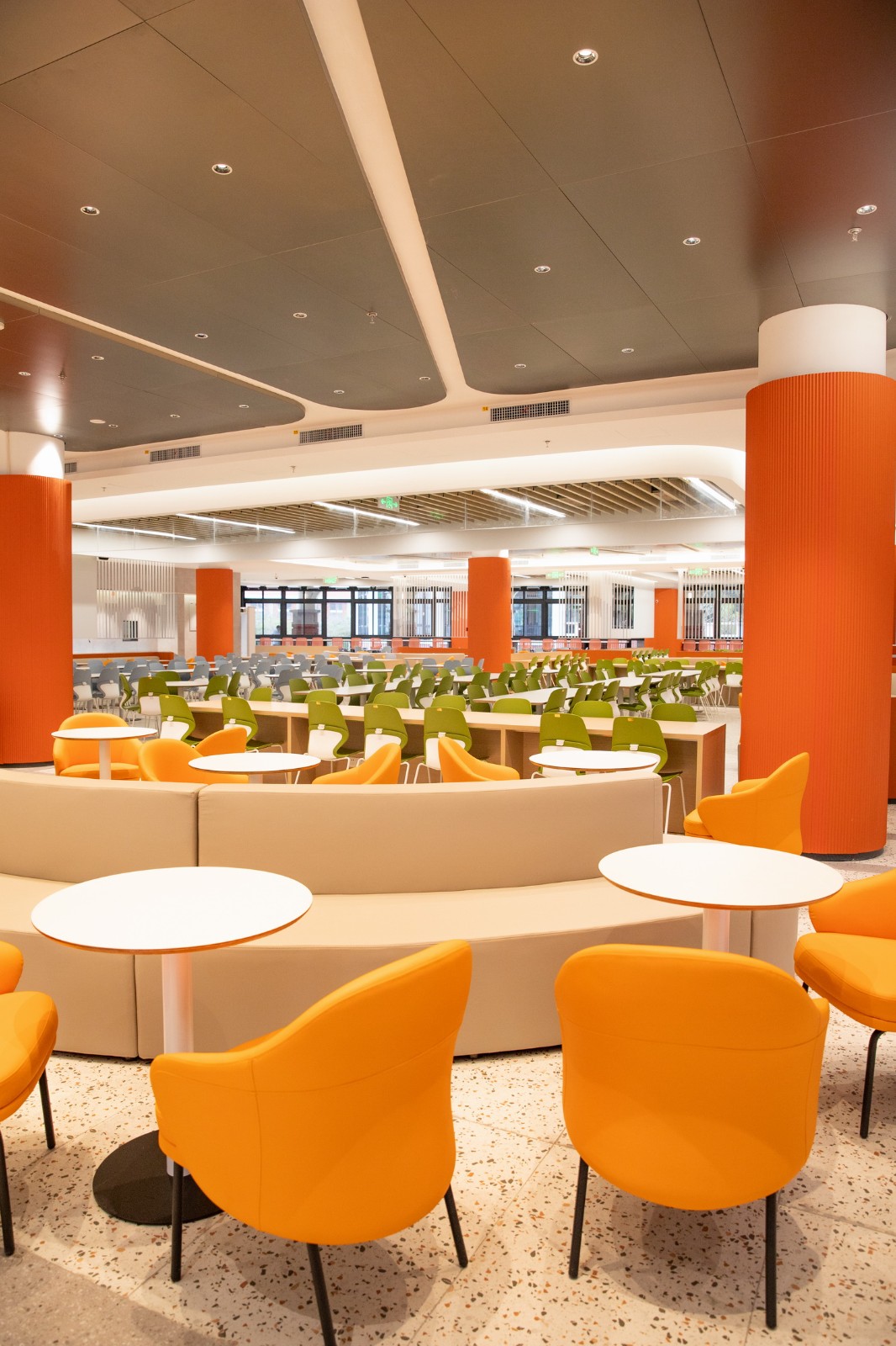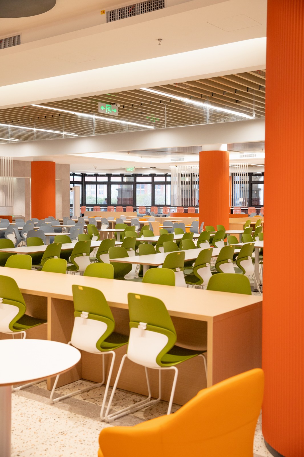 一层为大众通用餐饮区,以高起的绿植分区减少密集感,餐桌以四人长桌连贯布置而成,保留常规食堂快速就餐的需要,保证翻台率。