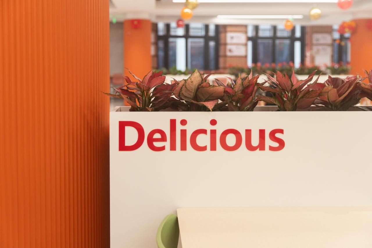 二层为就餐、学习、交流的场所,进行了特色化分区,各区域相对独立。悬空的竖向杆状隔断喷上了厦大老建筑剪影,在通透中又有隔离。家具色彩艳丽如果冻,餐桌为长方形与圆形交融,配以周边高脚凳及包围式沙发,共同形成了更为温馨的包裹感。各分区还配备有独立显示屏,可供学习交流、小型会议、娱乐使用。