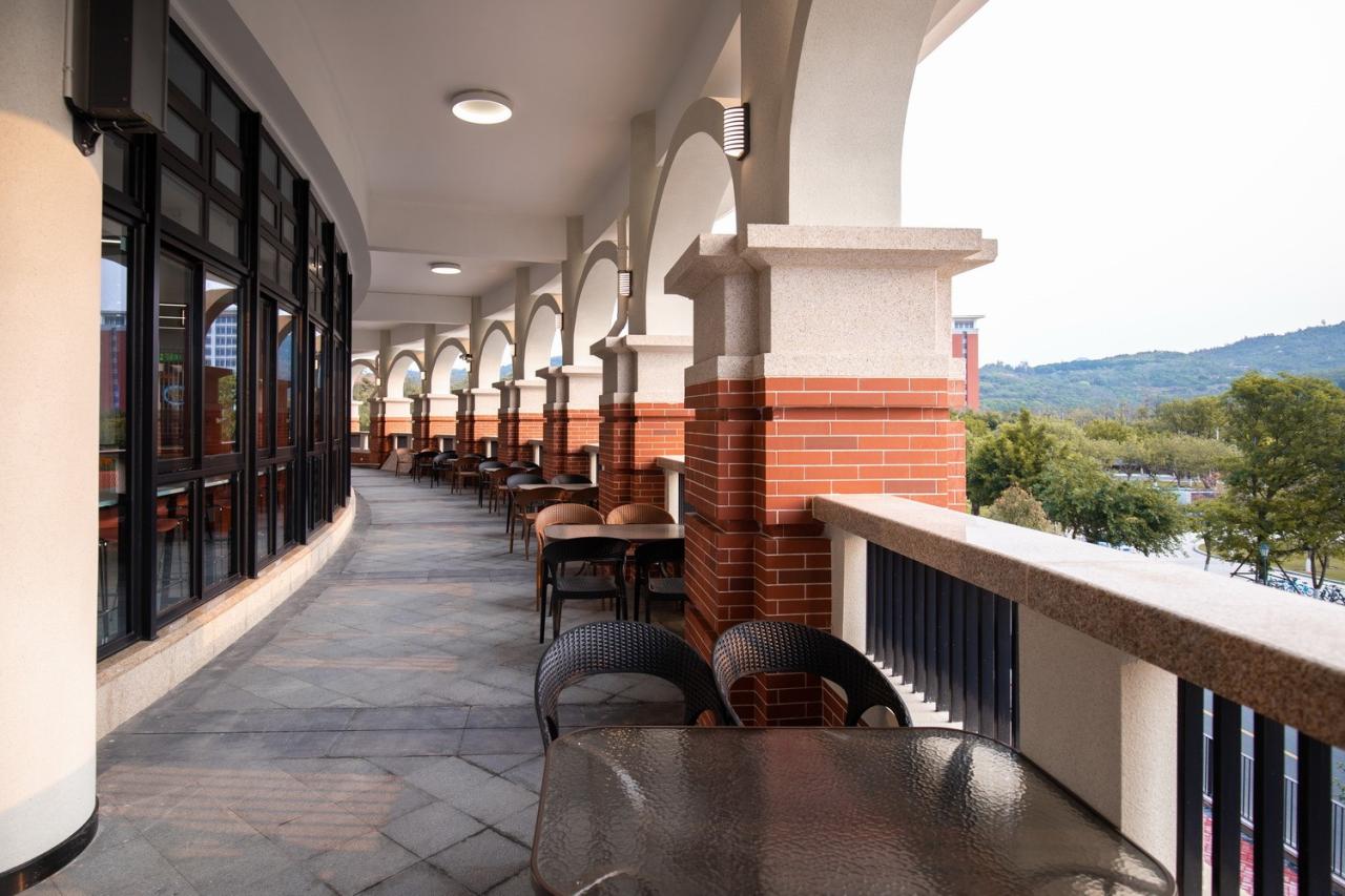 思源餐厅传历史文脉、承嘉庚风格。主体建筑以椭圆形绿色琉璃瓦屋面(红陶板瓦顶)统领全局,配以砖石镶嵌砌筑的西式墙身,整体造型典雅美观、古朴精致。弧形的体量柔化了建筑边界,搭配一层的骑楼空间与二、三层的开放外廊,既加强了建筑与周边环境的和谐统一,也创造出柔和流畅、动感轻盈的空间效果,在刚健理性的翔安校区中展现出绚丽隽秀的建筑风韵。