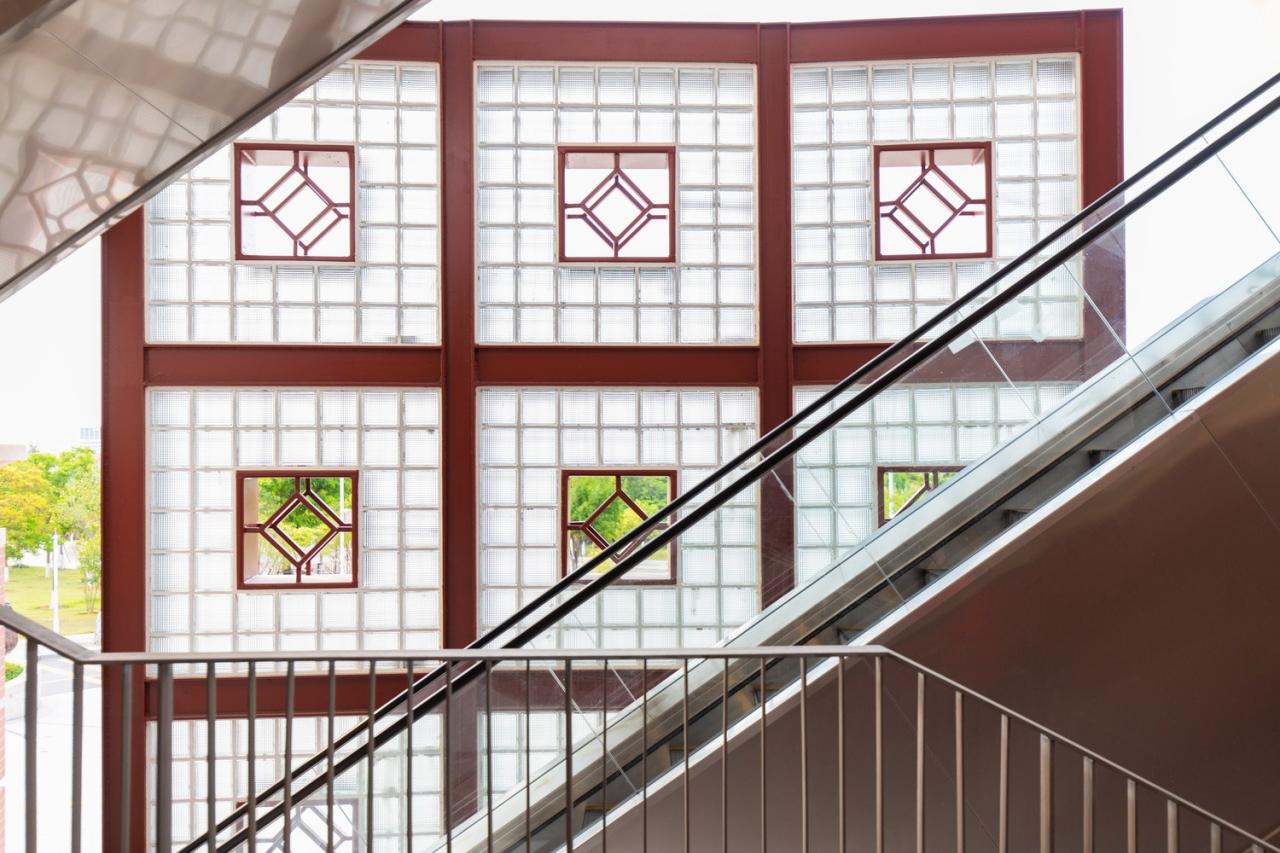建筑的材料、构造、色彩在传统与现代中交相辉映。南向主入口处用拱廊形成大门意象,H型钢组成的九宫格中用玻璃砖组合,体现了闽南墙体独特拼花“回”字元素;坡屋檐下方延伸出来的玻璃挑板在增加自然采光的同时,也在视觉上减缓了大屋顶的沉重感;红砖柱廊用现代工艺仿效上世纪60年代建成的芙蓉楼群,自然地带出了老校区的古早情怀;外柱廊间均匀布置的弧形三心拱,既有欧式罗马的拱形元素,又包含有澳门“老葡京酒店”的“欢乐”形象,带来更多凡尘人间烟火气,温情在这个转化为花边的拱上得到了呈现。