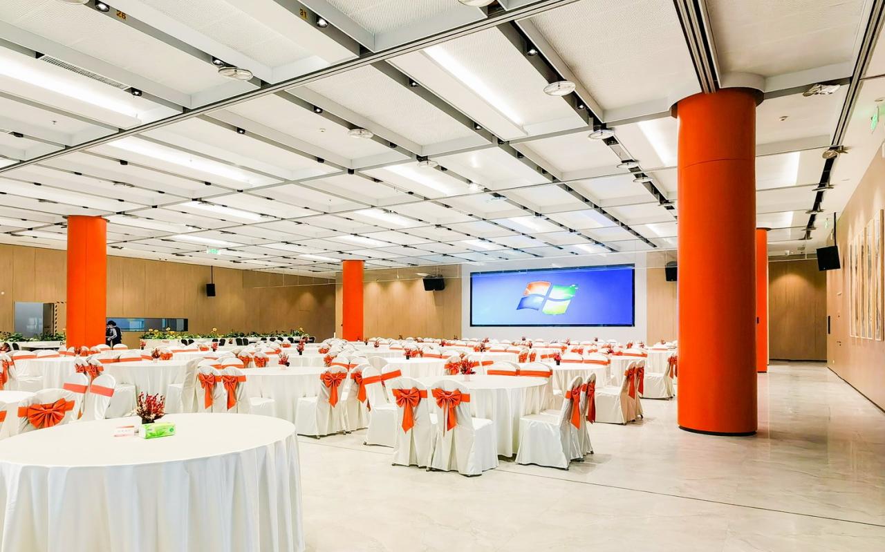 三层作为多功能宴会厅采用了去柱做法,形成了跨度为16米的高大宏伟空间。大厅风格简洁大气,四根红柱搭配暗藏灯具的均质吊顶,雍容华贵尽显于此。配合实际需求可自由滑动竖向隔断,形成满足不同人数使用的小型宴会厅。