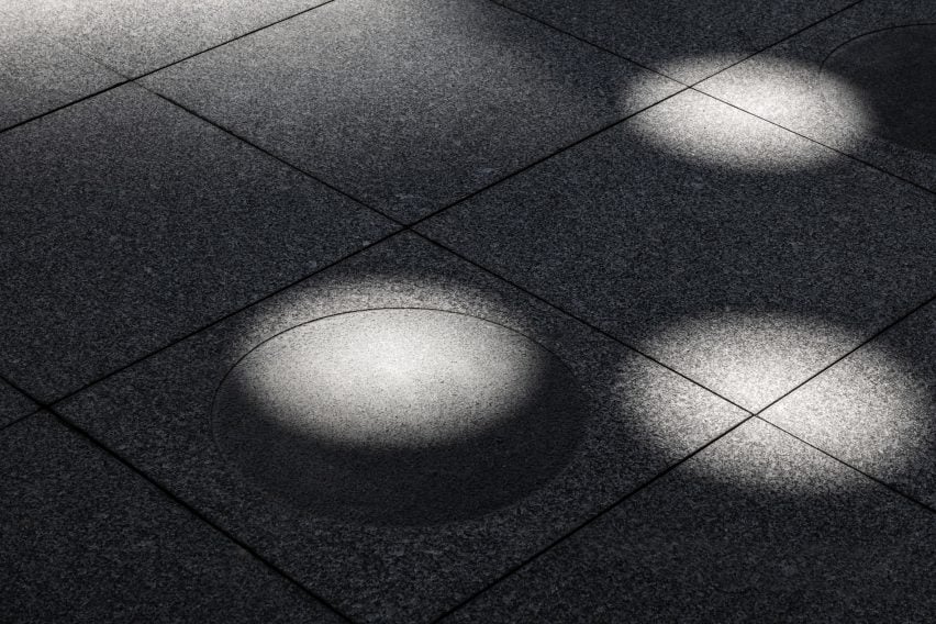 阿贾耶工作室说,它的表面被圆形的、镜面排列的开口随机刺穿,旨在过滤下面的光线,创造一个“光明与黑暗、坚实与空虚的诗意层。 钢制雨棚与下方广场上的圆形蚀刻相呼应,旁边的社区建筑外观看起来很工业,也是用钢制成的。
