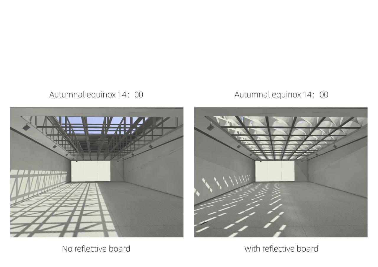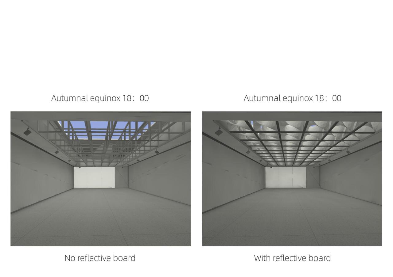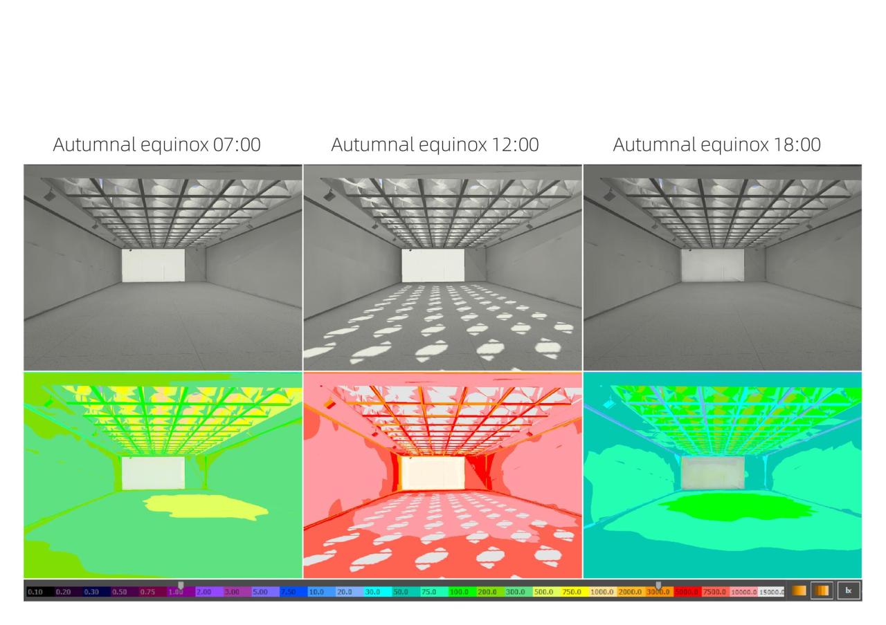 作为艺术展廊,需要根据展品类型控制室内进入的天然光数量,本设计的构思不是简单将天然光阻隔于室外,而是将落到地面、墙面的多余光线,消化在天窗系统里,让天窗系统成为在图案、色温、强度等方面具有动态表现力的画廊界面,同时仍保留了与天空的视线沟通,因而保留了室内空间的时间、天气等自然信息暗示。以秋分晴天为例,,逐时对比模拟显示,设置双曲反射板系统的室内采光更为均匀,光影更为柔和,强度更为舒适,且有效的避免天窗系统的眩光。模块化的反射板天窗系统如同过滤器一般,过滤了强光,在多数时间内保证室内光线的均匀和柔和,且日间的光照强度相对稳定。
