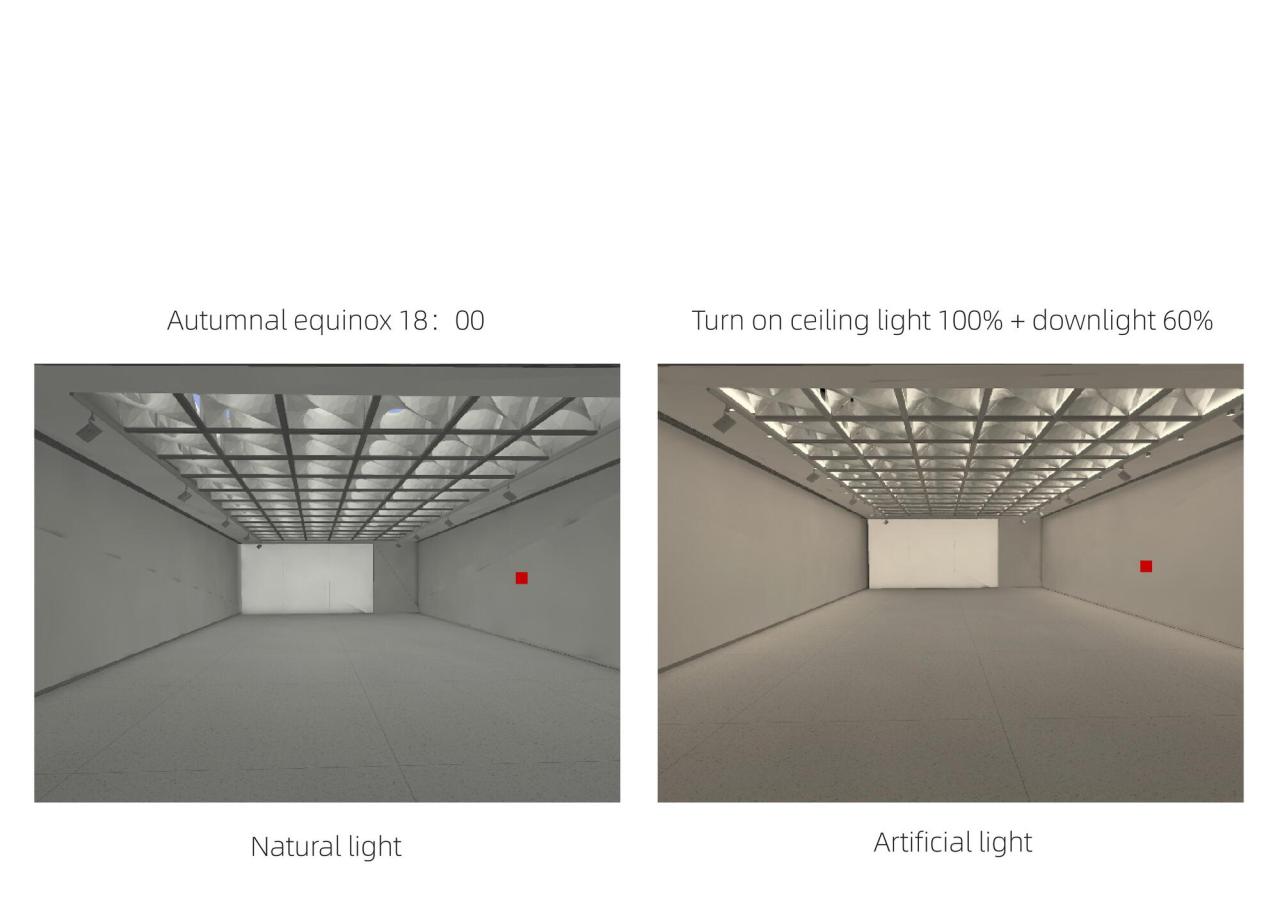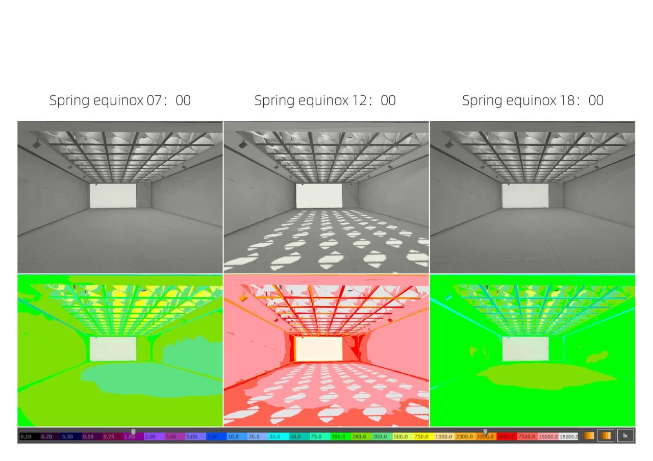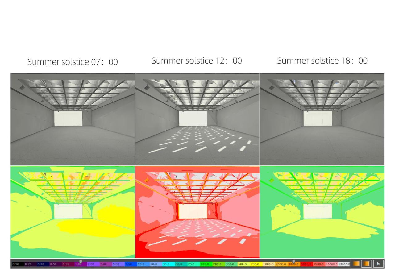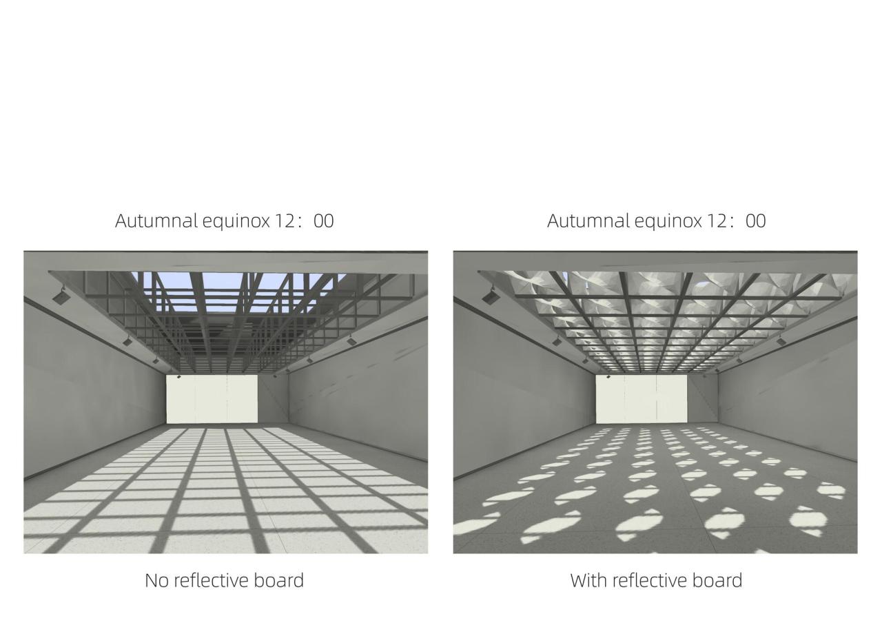 作为艺术展廊,需要根据展品类型控制室内进入的天然光数量,本设计的构思不是简单将天然光阻隔于室外,而是将落到地面、墙面的多余光线,消化在天窗系统里,让天窗系统成为在图案、色温、强度等方面具有动态表现力的画廊界面,同时仍保留了与天空的视线沟通,因而保留了室内空间的时间、天气等自然信息暗示。以秋分晴天为例,,逐时对比模拟显示,设置双曲反射板系统的室内采光更为均匀,光影更为柔和,强度更为舒适,且有效的避免天窗系统的眩光。模块化的反射板天窗系统如同过滤器一般,过滤了强光,在多数时间内保证室内光线的均匀和柔和,且日间的光照强度相对稳定。
