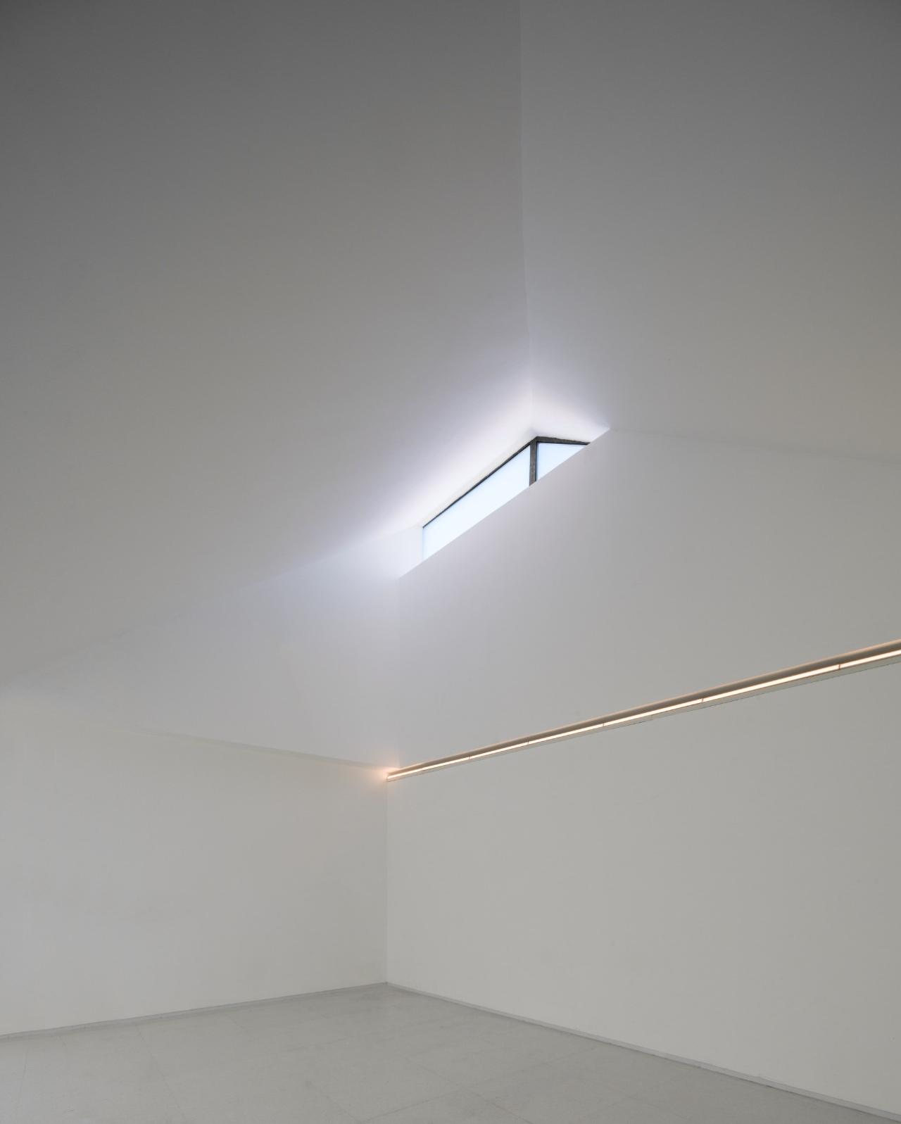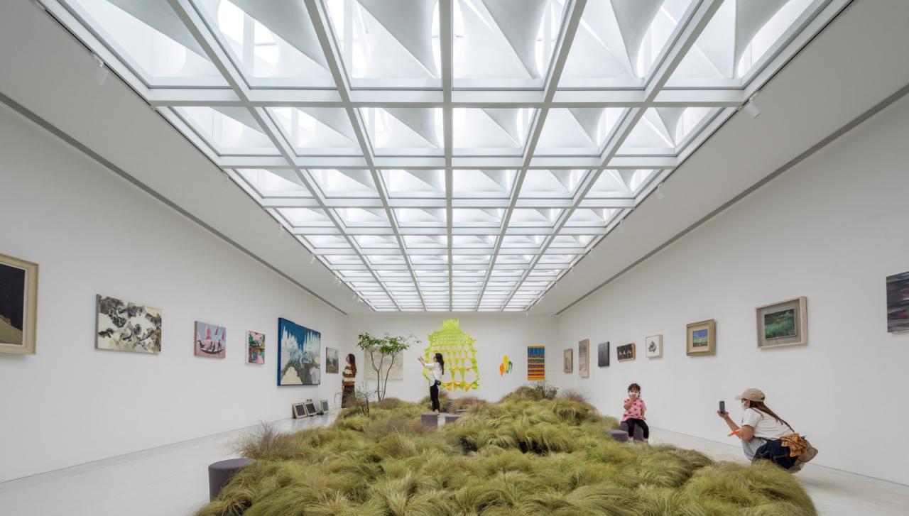 建筑顶部东西两侧分别有两个较大的斜坡天窗,分别对应接待空间和展厅的入口空间,空间较高,有天光倾泻而下。中部展厅的顶部为网格状的大天窗,几乎占满整个空间。每个格子中放置一个双曲面的漫反射板,用来分散光线,以形成较为均匀的自然光。