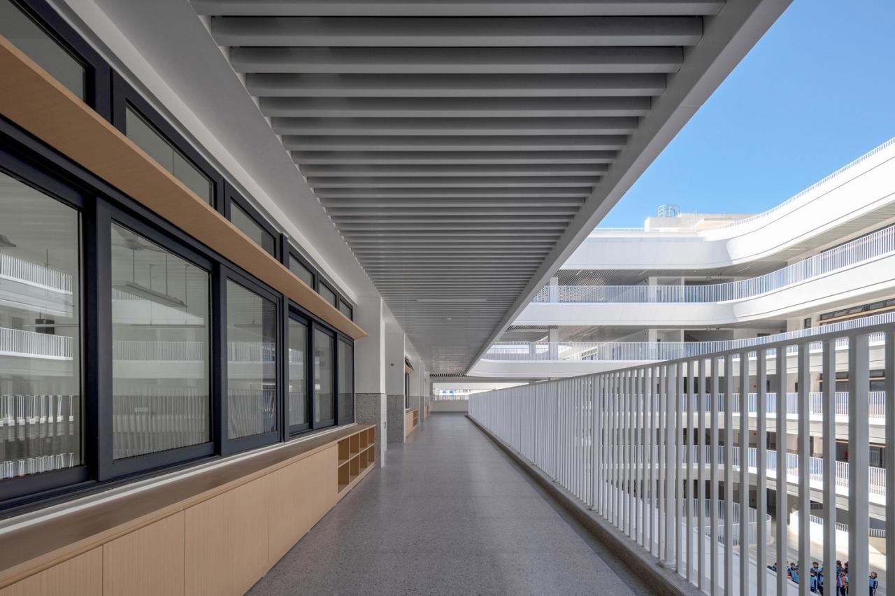 山之形金榜广场的对面,绿色屏障郁郁葱葱,山体连绵。设计团队选择了相对集约的形态策略,依山就势、错落连接,将原来山坳一侧的陡直化为有节奏的退台,运动区建筑体平铺般倚山面城,用长而低的体量护住山体,延续其平缓的趋势。山脉是建筑的背景,围抱校园,建筑群体量适宜,一部分有节奏地抬升、一部分自然放松地舒展开,整体塑造了金榜路东侧新的城市形态,自上而下展示自然与人、与城市积极融洽的图景。