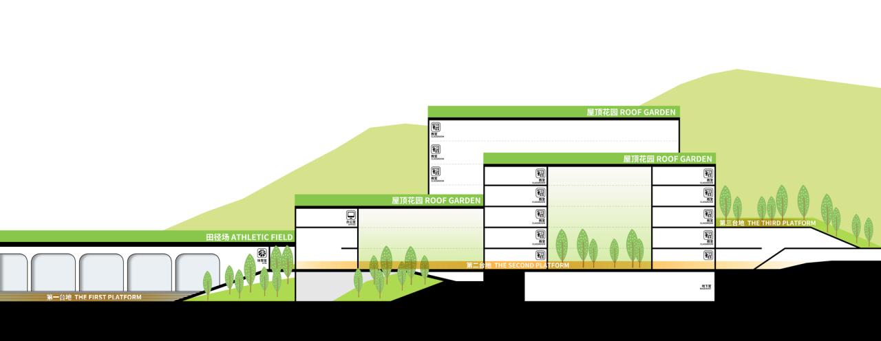 阳光顶建筑在多个台地上架起、连接,整体校园形成一个具有充分可达性的观景平台群,在坡向城市的山脉西侧,不同标高的屋顶平台,适合远眺,也适合对望。金榜路上的人们看着学校,在火车站旁的绿色山边,台地与屋面的错落、堆叠,塑造了多个环游路径,想像孩子们在课间自由地跑出教室,去到不同高度的平台眺望,一边是山,一边是城。