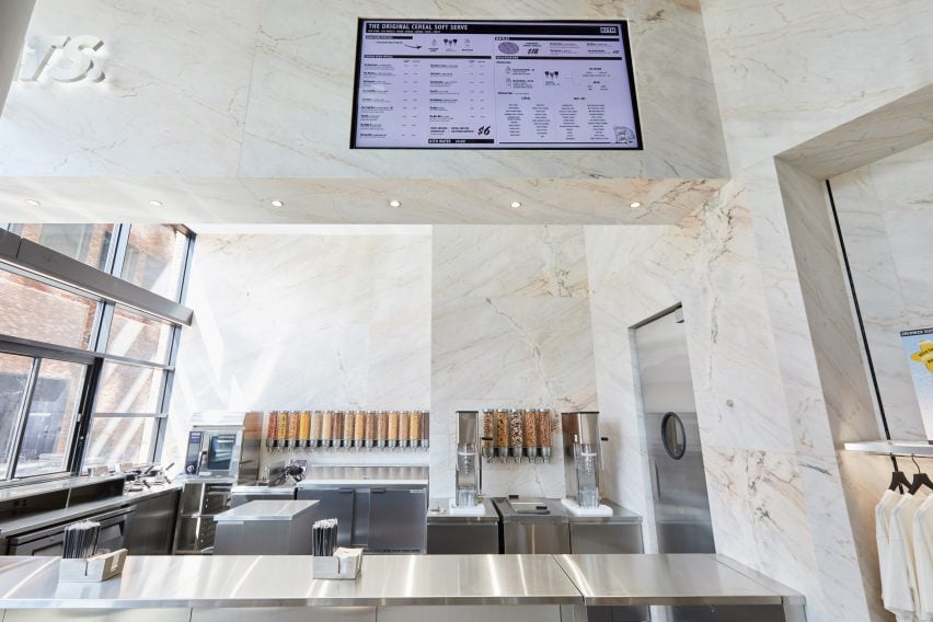 该品牌表示:“外面郁郁葱葱的橡树和遍布整个商店的大量绿色植物平衡了工业氛围。”入口处的“肯特招待区”(Kith Treats)——供应冰淇淋和麦片的组合——铺着罗莎-奥罗拉大理石,有一扇通向广场的可供使用的窗户。