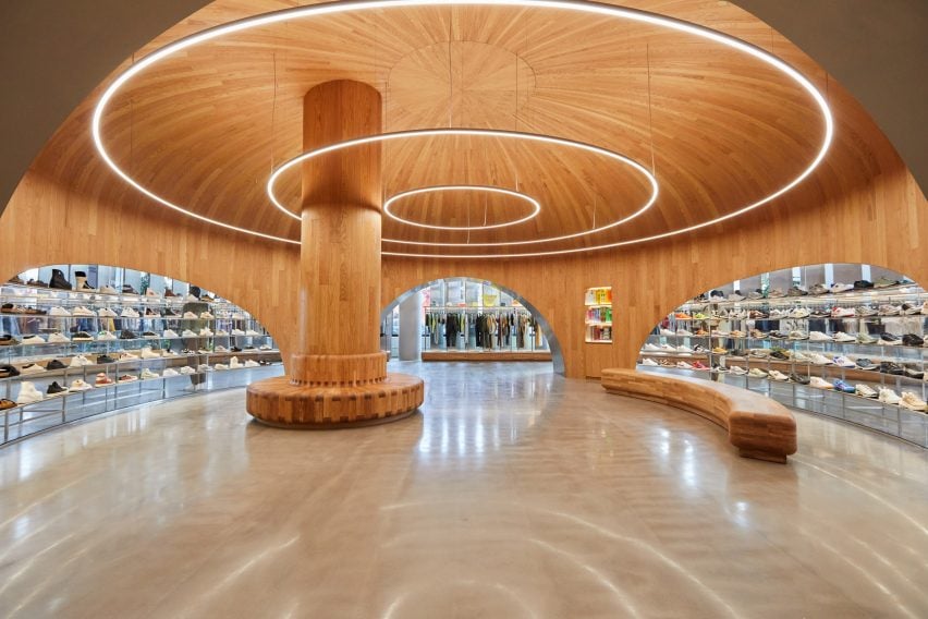 该结构中的许多倾斜拱形空隙的下侧有金属内衬,两侧有一个入口,另一侧有该品牌运动鞋系列的展示柜。“基思”的创始人罗尼-菲格说:“我们完全从头开始建造了中央穹顶,并用与主楼外部相同的砖建造了外部,所以当你进入时,它感觉非常有凝聚力。”