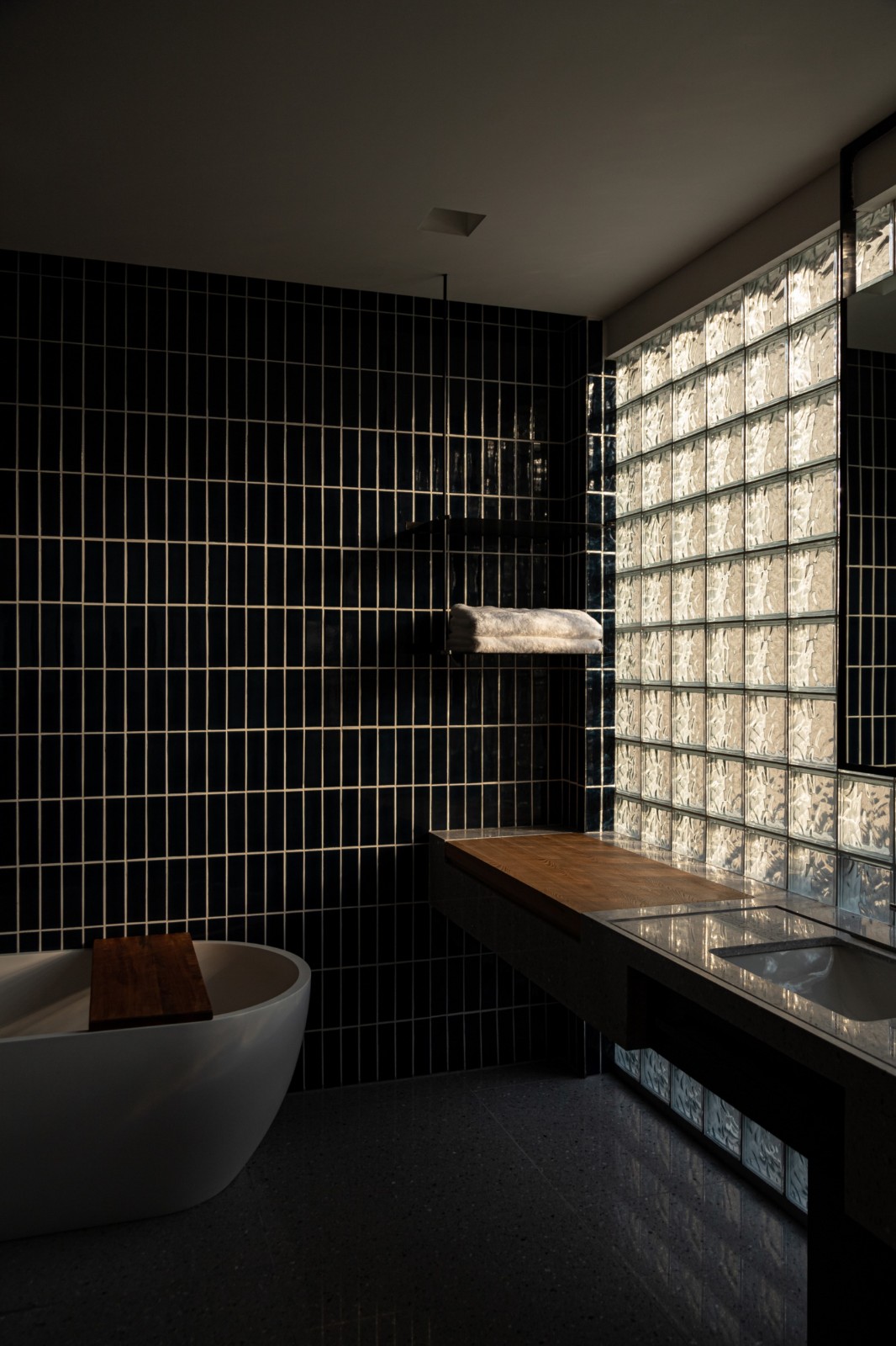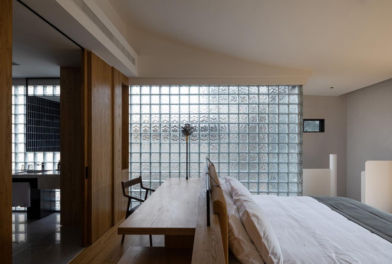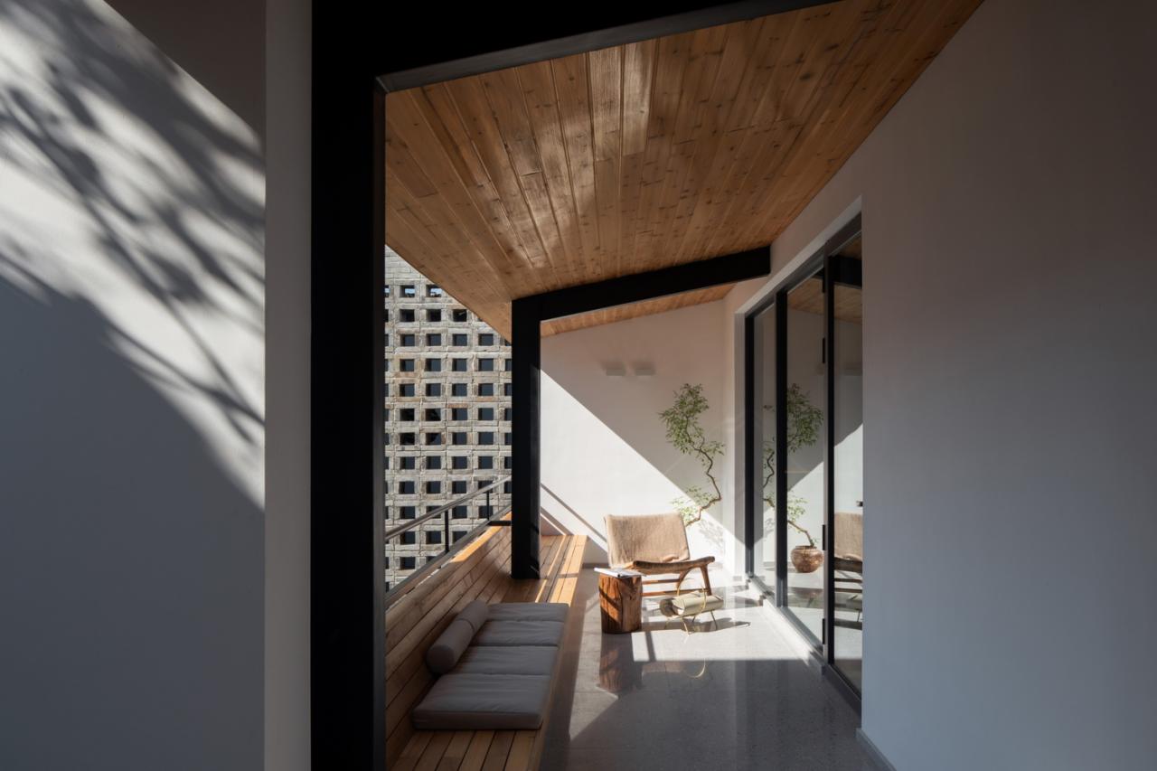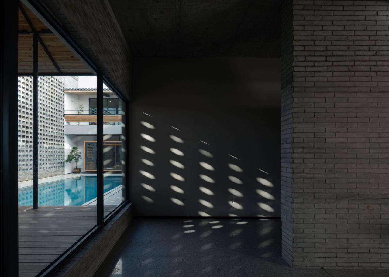 为了保证室内的光线,庭院与天井仍然是我们整个设计中的核心,用天井及庭院分离建筑体块来保证充足的采光。通过玻璃砖墙、屋顶的天窗、不同形态的格栅导入光线,营造不同的空间情绪。通过光影的变化和移动,让在这个空间的人可以感受时光、引人遐思。