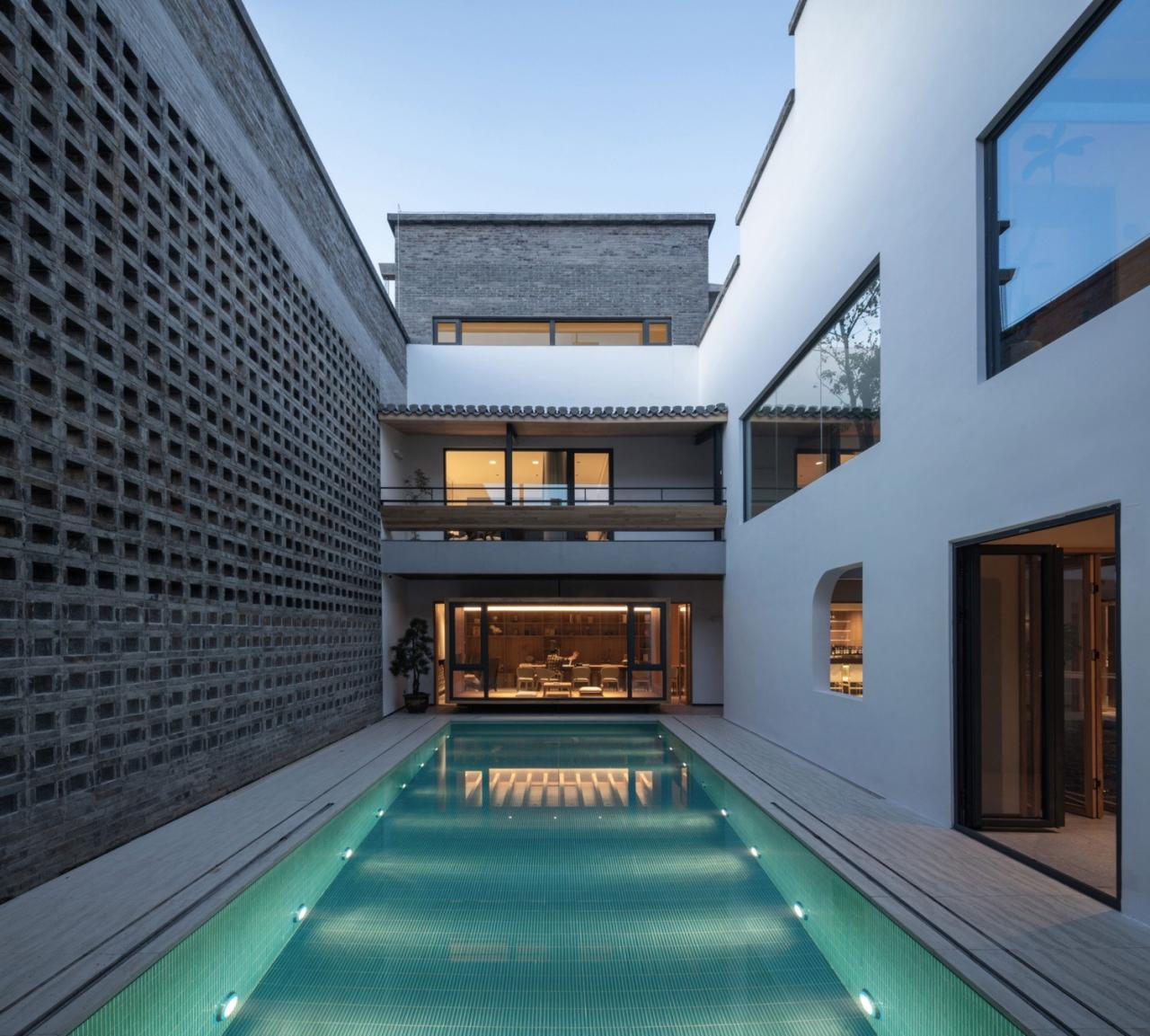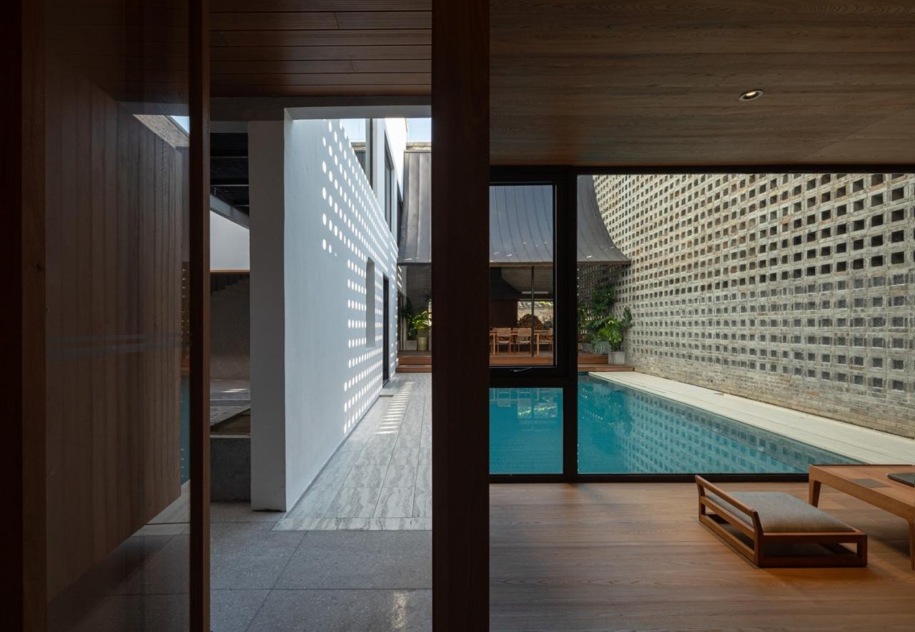 所以我们有违常规的将公共客厅与接待区放置在建筑的中心位置,从中心再往四周辐射。从入口开始进入到前庭院,再转换到玄关处将视线定格在玄关处的墙上,再转经过泳池、楼梯及内庭院最终到达接待公区。我们希望当人们在进入到这个建筑的时候就开始整理思绪和调整心理,虽然这是一段短短的行走路径,但当他行走在这种“不确定性空间”的时候可以让他感到新奇,激发他对这个空间的探索和好奇心。