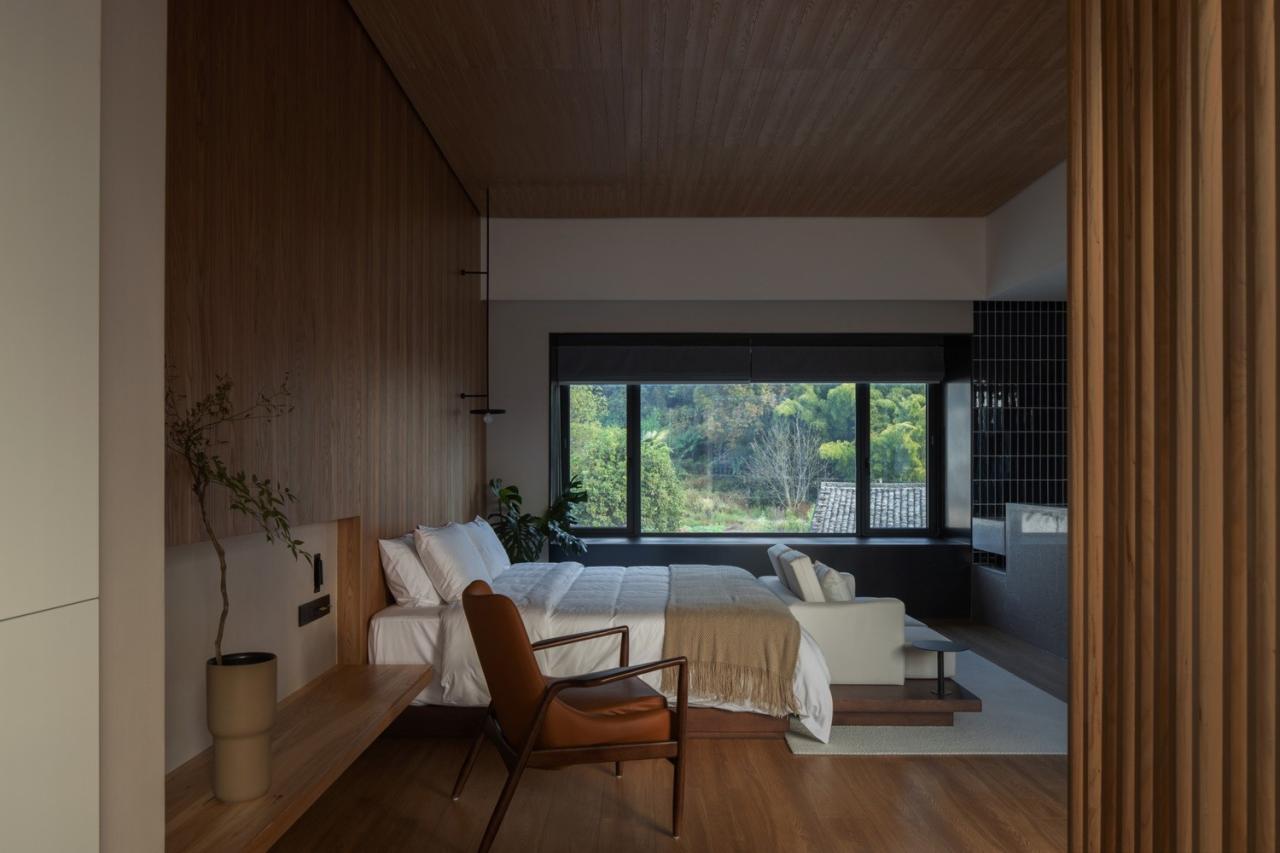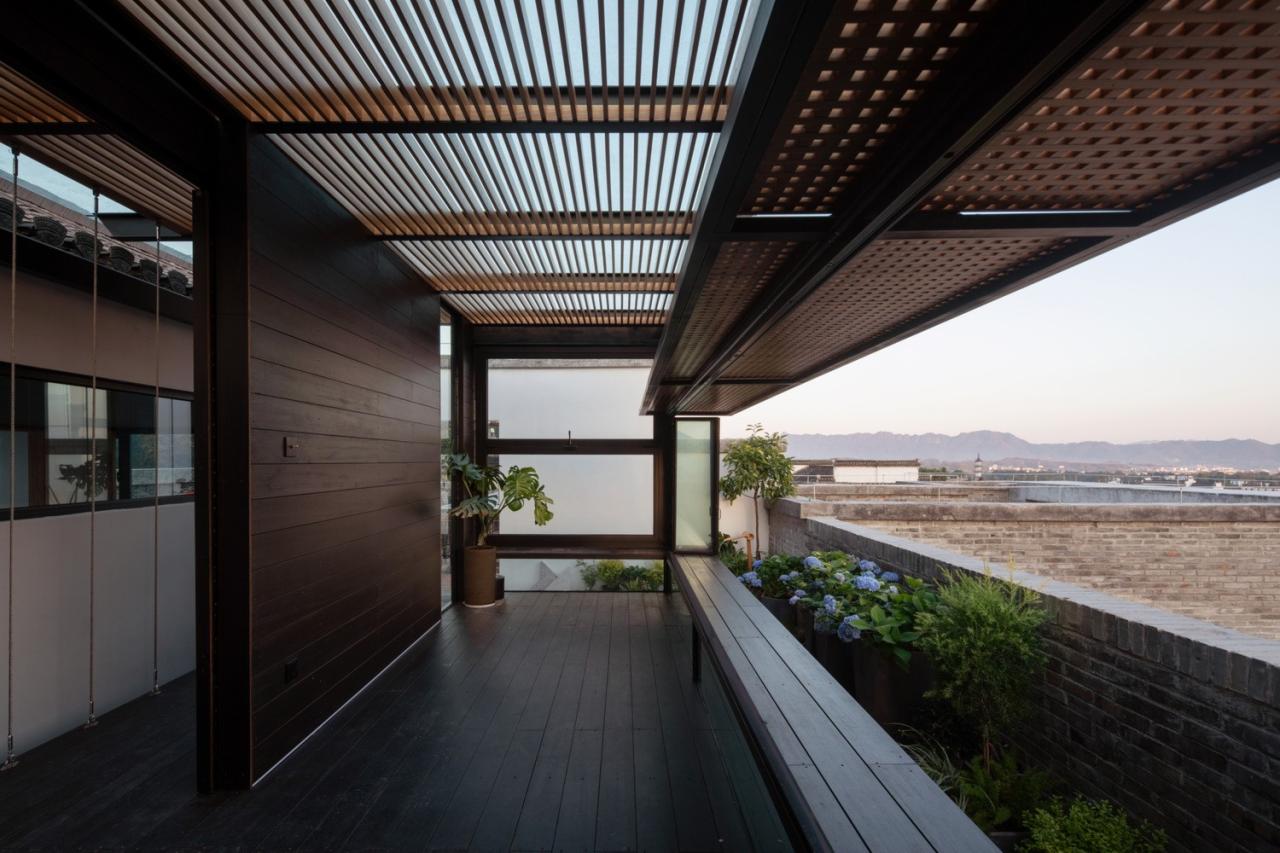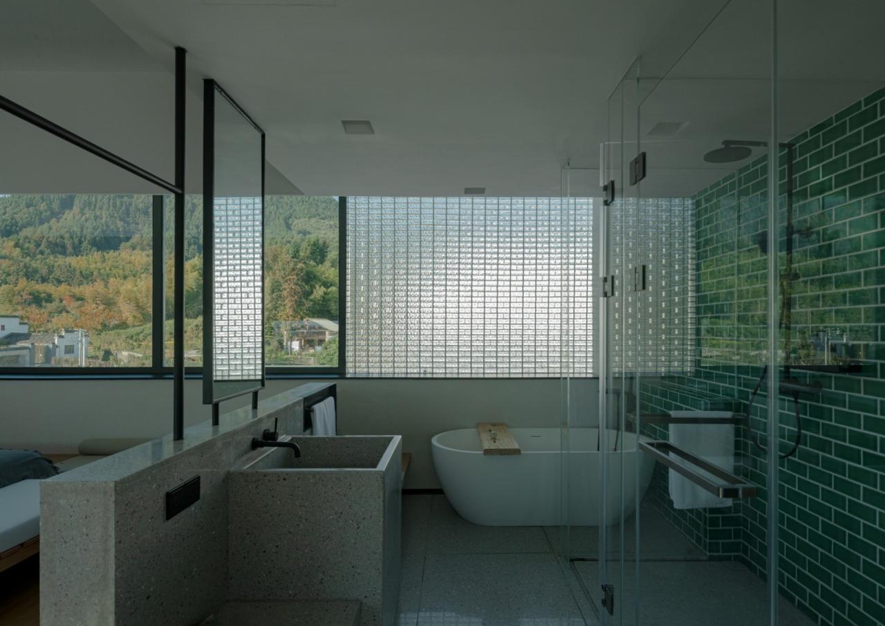 临周边民居的建筑的墙与院落几乎不作任何的开窗,通过内部庭院和天井去制造视角与景观,在内部间隙中去与自然互动。在一些不得不开窗但又与邻居离的很近的空间,为了保留一定的隐私性与舒适性,我们采用视觉错位的方式去进行规避。如突破常规高度视角的高窗或极低的低窗,让它既可以保证光线和通风又能避免视觉上的直视。同时还尽量将窗创造成一个取景框,将外面斑驳的古砖墙框成一副画,将绿郁葱葱充满生机的植物内庭塑造成一个橱窗,抑或是框住远处的碧山。