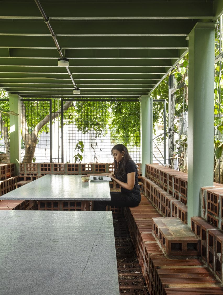 他继续说道:“设计语言旨在唤起灵感、创造和合作的文化,同时培养非传统的工作室工作方式。”工作室空间的正面被分为两半,顶部是陶土块,底部是水泥板。
