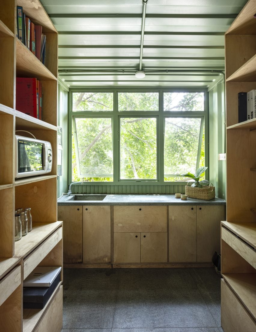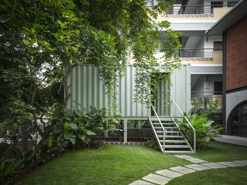 塔利耶森工作室联合总监夏利尼-钱德拉谢卡(Shalini Chandrashekar)说:“雕塑型楼梯的骨架是由一块弯曲折叠的不锈钢金属板制成的,用来支撑主体结构。”在花园里,一个来自最近港口的废弃集装箱被改造成了材料库,供员工使用。夏利尼-钱德拉谢卡说:“集装箱来自金奈的一家经销商,金奈是距离班加罗尔最近的港口。”经销商提供航运业丢弃的集装箱。“