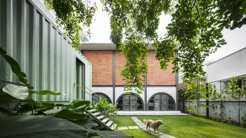 她继续说道:“转换过程中最具挑战性的障碍包括改变集装箱的尺寸、处理外部并将其与内部隔离以保持热舒适。”在凸起的图书馆下面的较低楼层是一个有盖的空间,工作室设想将其作为用餐和社交的庭院。花园里增加了一条由石砖制成的蜿蜒小路,将材料库与主楼连接起来。