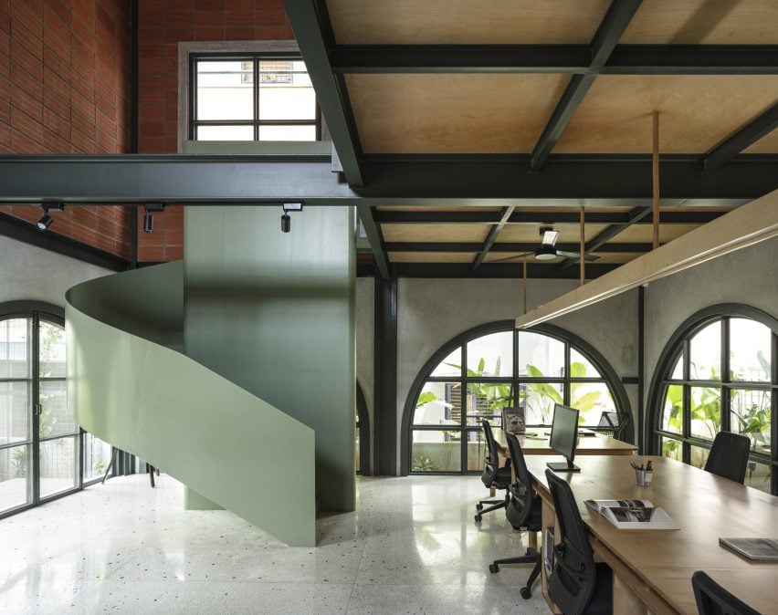 现场制作了各种特色材料,包括地面的水磨石地板,这些地板是用回收的石头碎片铸造的,以及带有桦木胶合板和金属腿的家具,如办公桌、椅子和桌子。为了给室内创造一个焦点,工作室增加了一个鼠尾草绿色的金属螺旋楼梯,选择它来反映周围景观的颜色。