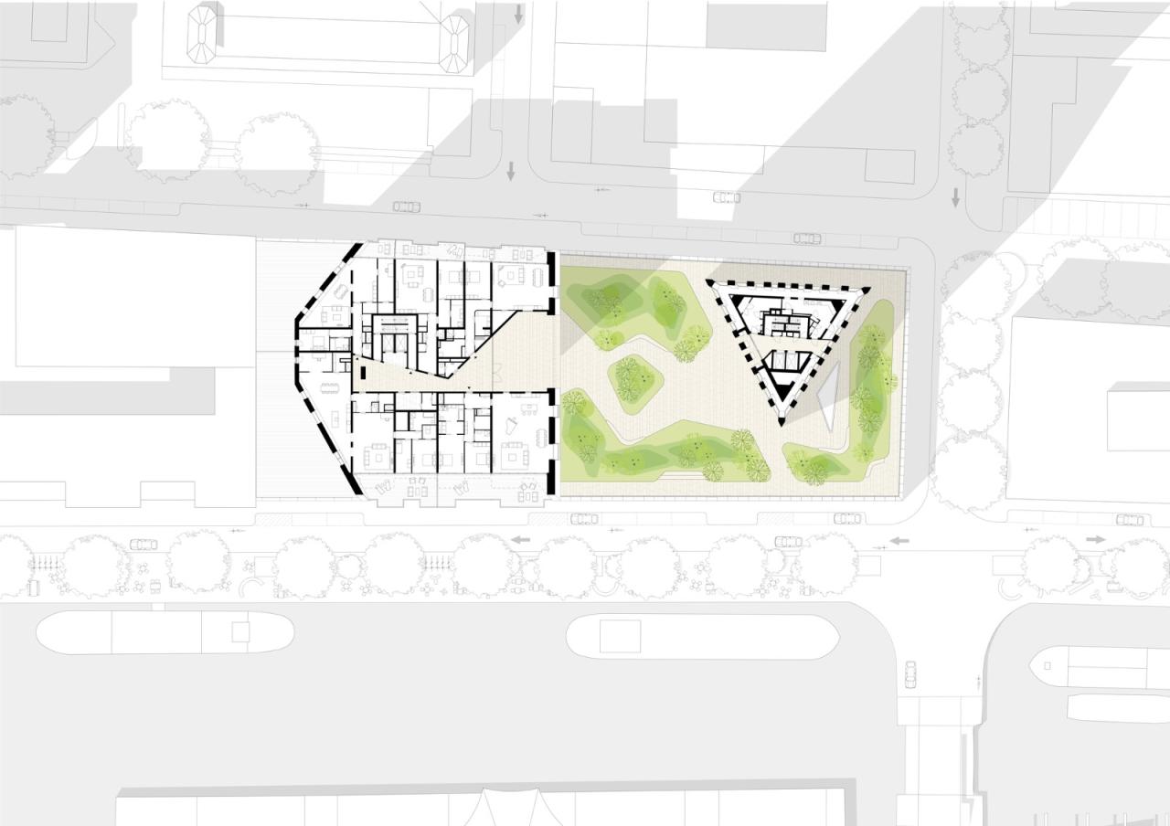 基座上的雕塑CasaNova 的独特外形是对 KCAP 城市规划的创造性回应,该规划规定,每平方米的地面可建造 22 立方米的建筑。我们选择在底部削减体积,在顶部增加体积,使其看起来像雕塑一样在基座上保持平衡。纤细的体量为周边建筑创造了最佳的视线和日光,并为 1600 平方米的屋顶花园提供了空间,CasaNova 和 Muse 的居民可以在这里相聚。屋顶花园位于五层,而不是塔楼的屋顶,因此花园也与地面层相连。