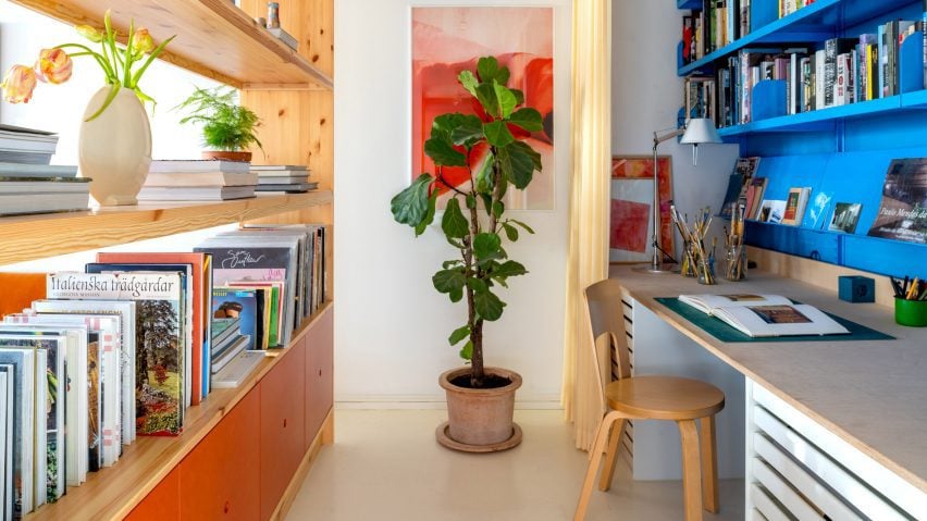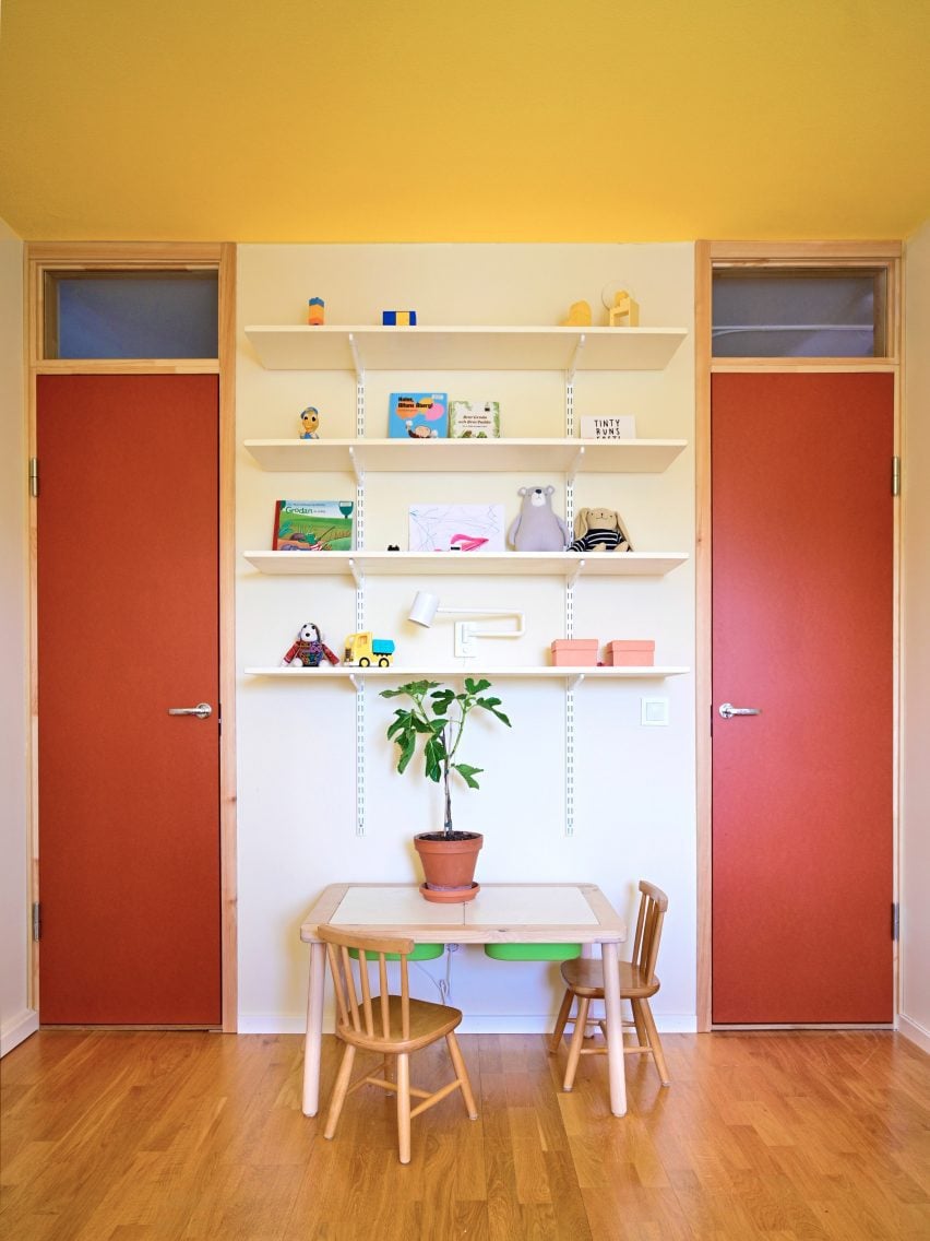 一个用有机形状花瓶装饰的大书架隔板在开放式客厅和办公区之间形成了一个隔板,焦橙色的搁架系统提供了额外的储物空间。办公区也可以用窗帘围起来,以营造额外的宁静。建筑工作室的Elephant餐具柜——一张厚实的蓝色桌子,因其坚固和色彩而得名——也包含在生活空间中。这家人的双胞胎共用一间卧室,可以通过两扇又高又窄的门进入,给公寓增添了一种有趣的感觉。