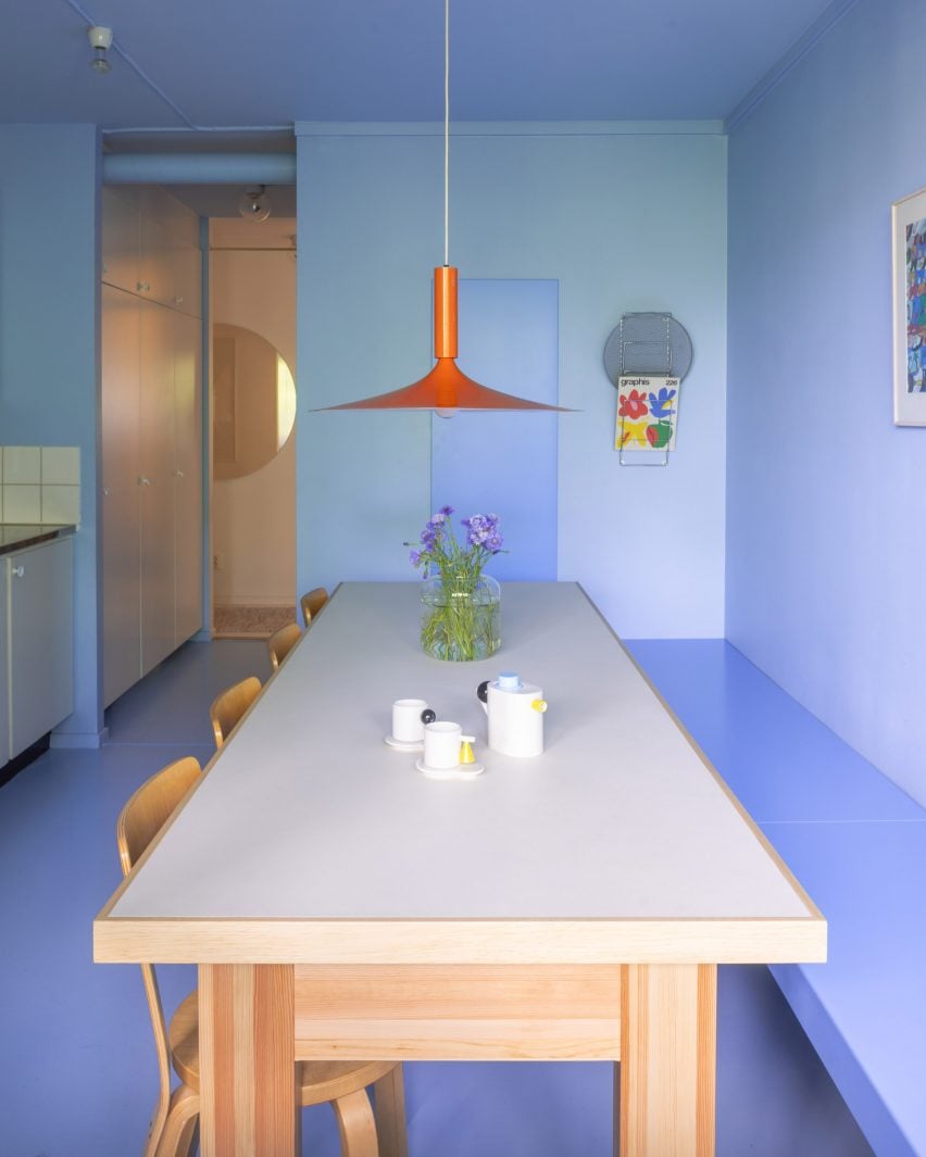 维斯布洛姆-克拉塞工作室还选择了松木和红色中密度纤维板的组合来制作定制的细木工和家具。厨房采用了从地板到天花板的蓝丁香色调,餐桌旁边有一个内置的几何长椅,还有一个隐藏在“暗门”后面的高橱柜。