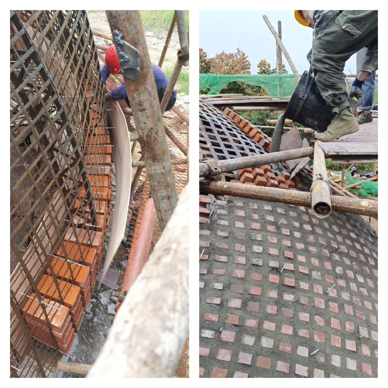 砖随双曲面分布是对建造的极大挑战。砖块通过开孔钢板定位,再用灌浆料浇筑的方式完成建造。