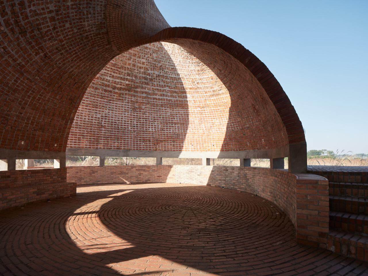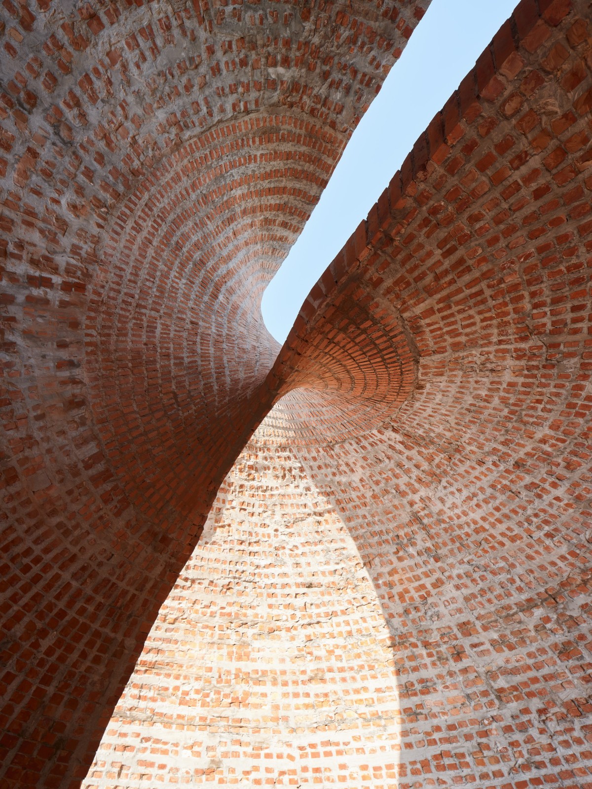 12种宽度的切割砖顺uv线分布,以保证结构径向的连续性。砖壳由此形成了新的建构逻辑和视觉表现。从层叠咬合的砌筑,成为网格化的浇筑。像素化的点阵分布颠覆了砖的建构印象。