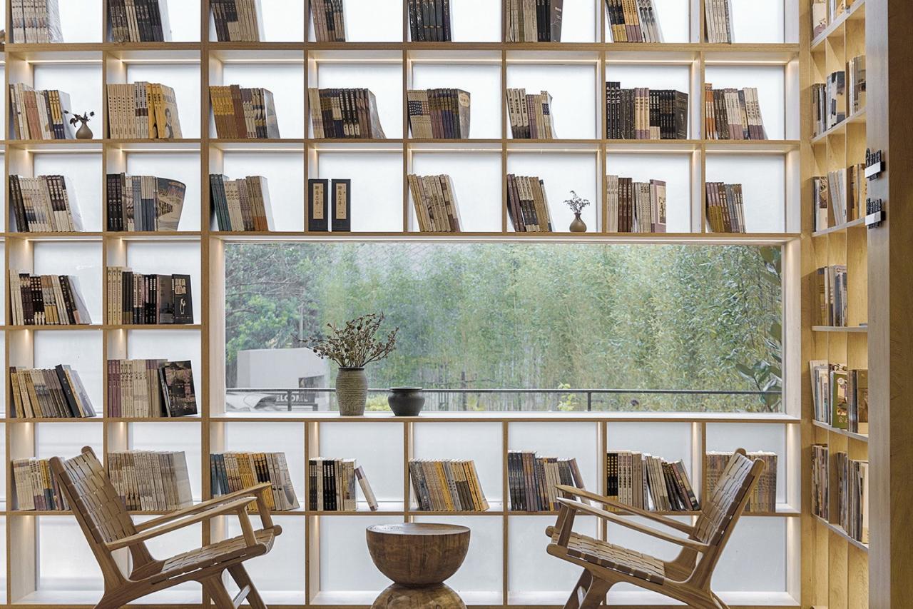 如果说外部的整体化壳体是对原有建筑的抽象转译,那么书屋中央的木盒子则是对书架最原始形式的具像呈现。其以正方网格的形式,强化传统书架的意向,外部的山型壳体作为灰空间,包裹着中间的书架,两者之间的空隙用玻璃幕墙填充,通过透明的幕墙能够望到后山的树林,使书屋处于室内和室外之间。