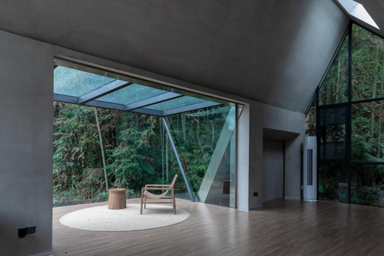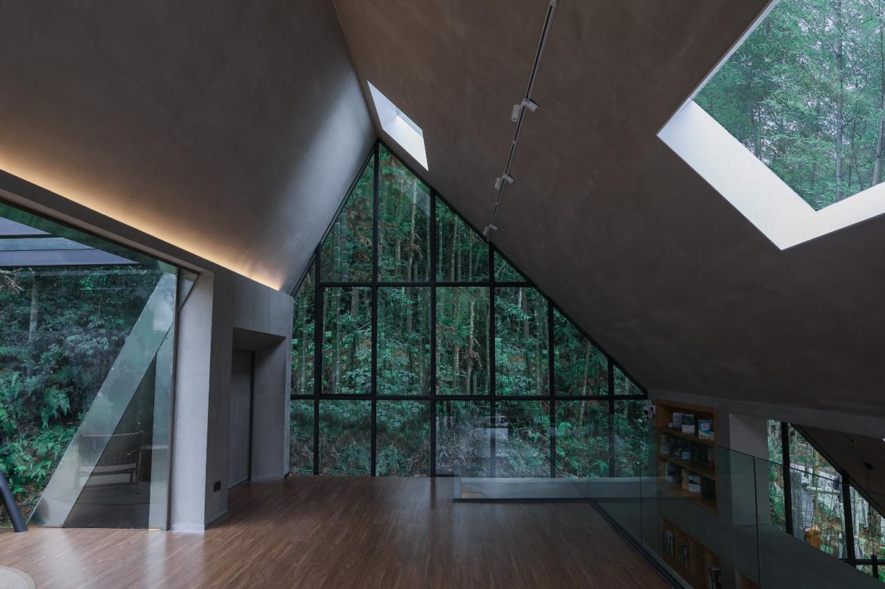 书屋的二层是被连续坡屋顶包裹的阁楼空间,尺度上相比首层与身体更为相近。大小不一的天窗,全通透的落地景观窗,开向首层的长条洞口,行走或盘坐其中,天空、森林和活动的人,同时流动在空间里。
