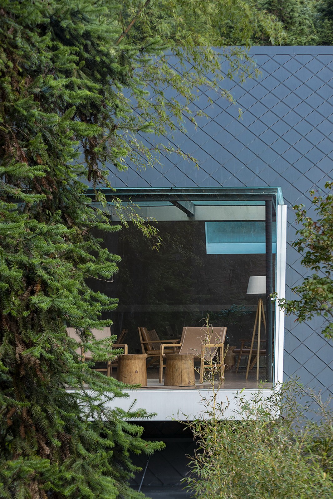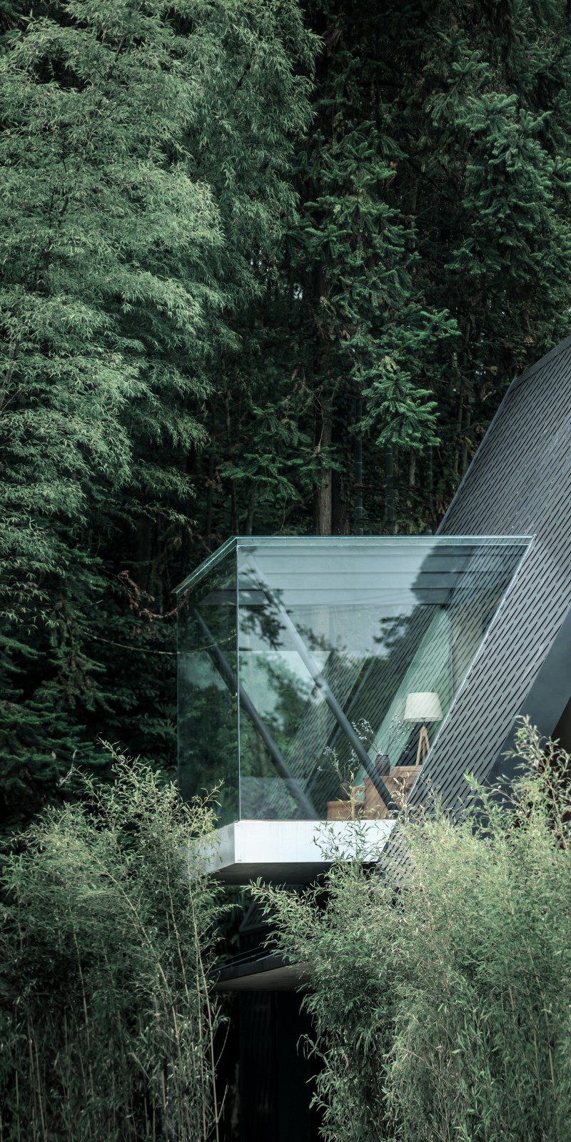“登山”路径的最后一站为破屋面而出的玻璃盒子,漂浮于树梢之上,置身其中完全被树林包围,以最小尺度的距离感受自然,达到空间体验序列的最高潮。