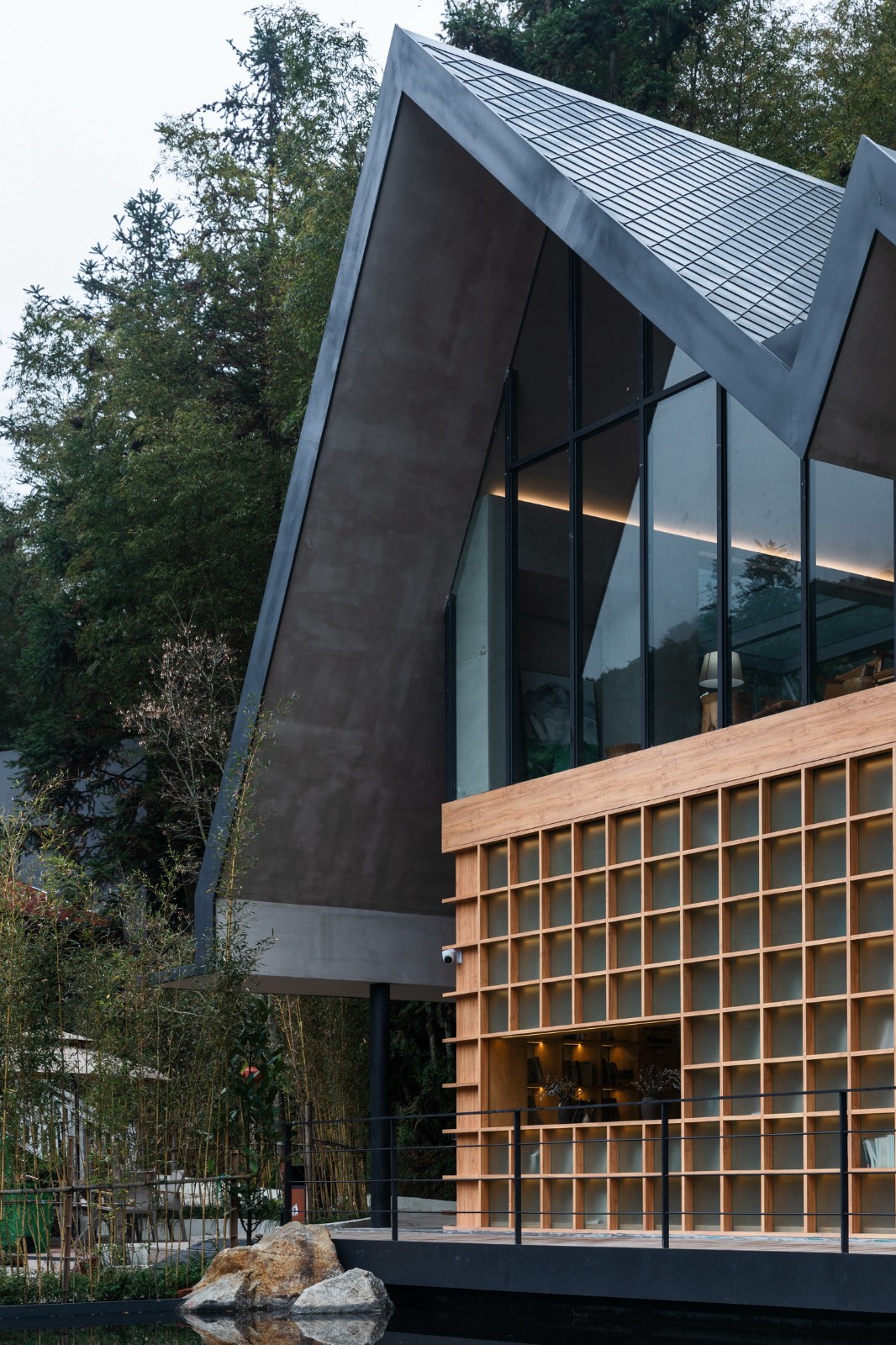 由于原有建筑体量已不能满足新的功能需求,经过谨慎评估,很遗憾地将整体建筑进行拆除重建。带着这份惋惜,我们设想延续原有建筑的气质,以人字屋面为原型,用高低不一的两个单元形成新的连续屋面形式,与墙体乃至地面连成一体。重复叠落的屋面使建筑体量得以极大地削减和弱化,让建筑嵌入山体之中,回溯建筑与环境的关系。