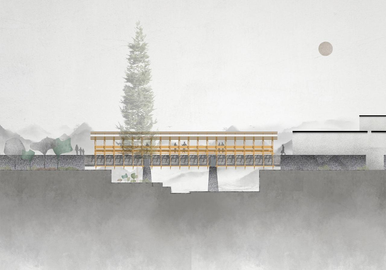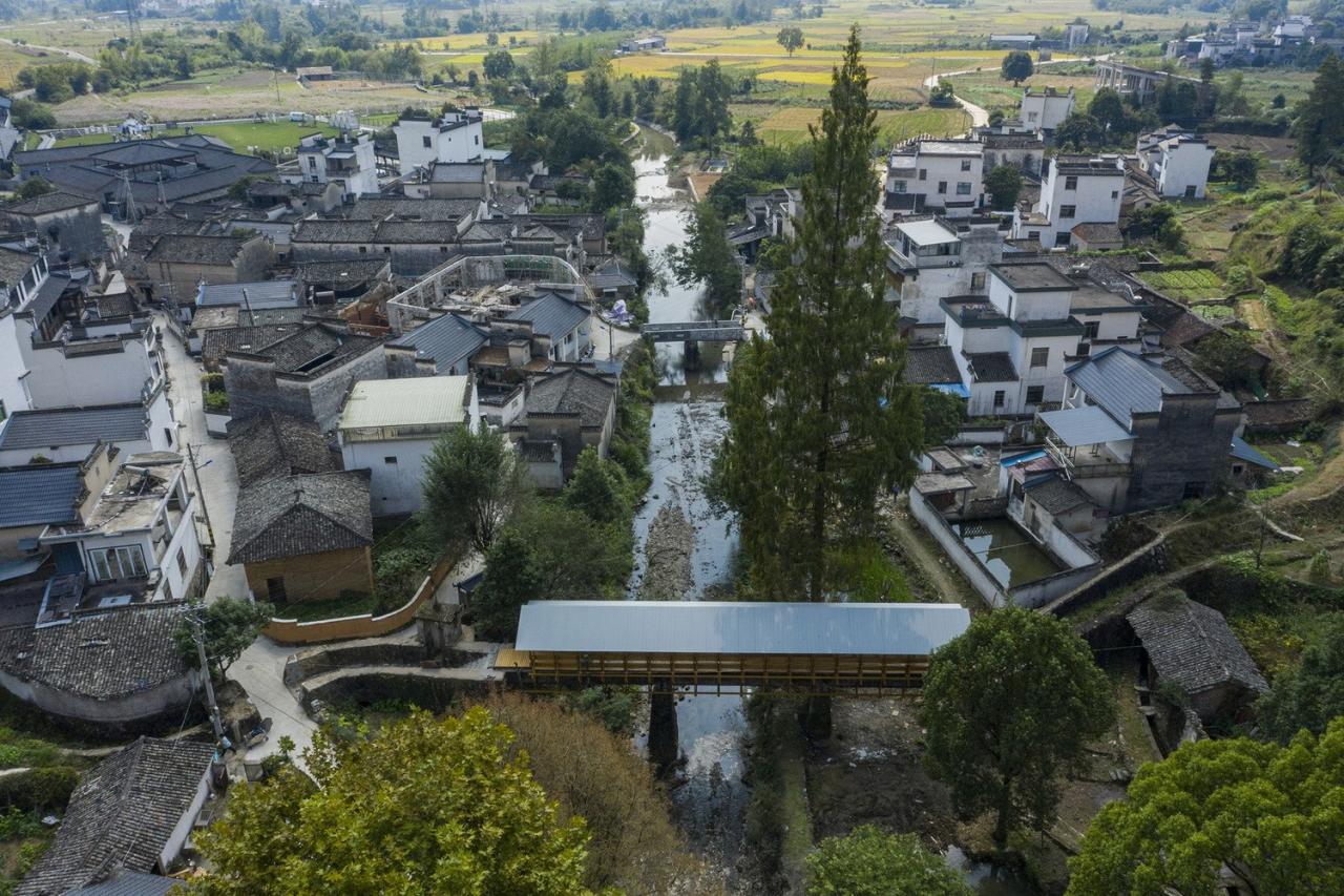 为延续村庄集体记忆,我们保留了水渠原始结构与岁月痕迹。在水渠躯体上附着一个轻质木结构桥身。木材的使用不仅呼应了传统徽州建筑的在地性,也提升了这个新基建与人的亲近感。