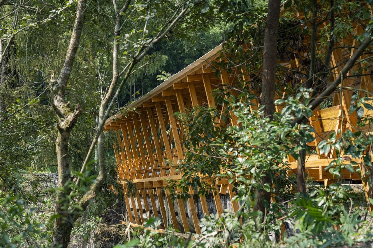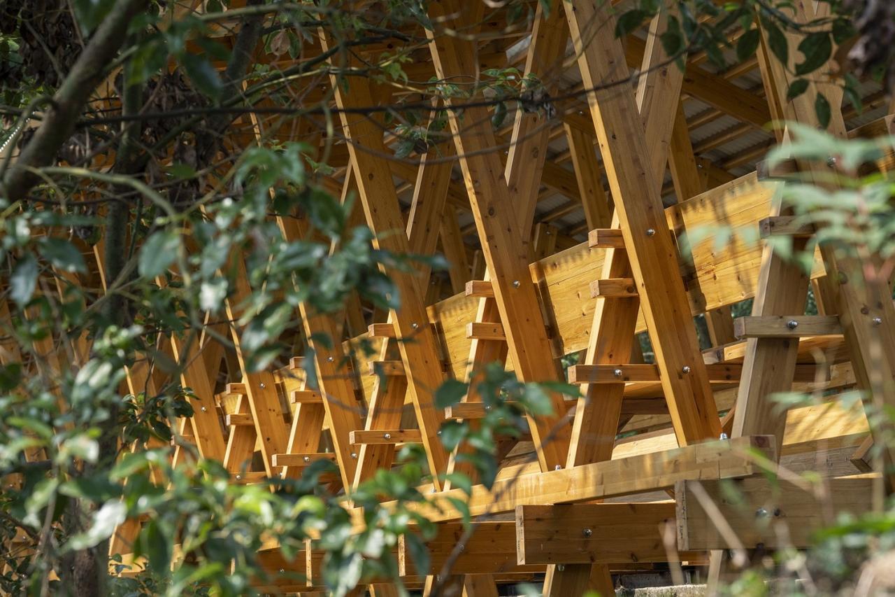 结构材料选择上,“水渠廊桥”采用了工厂预制的工程木(CLT)。这种材料受力均匀、轻质高强、节约木材、绿色环保。设计后的桥体由19榀小截面交叉结构单元组成,形成缠绕于老水渠的密肋体系。每榀结构单元由两组独立的交叉柱组成,撑起各自屋面。