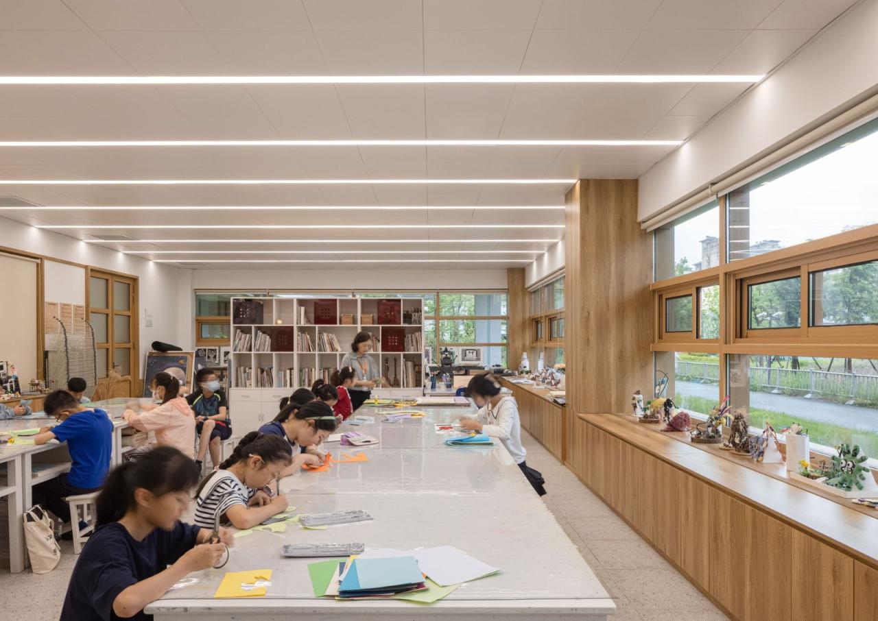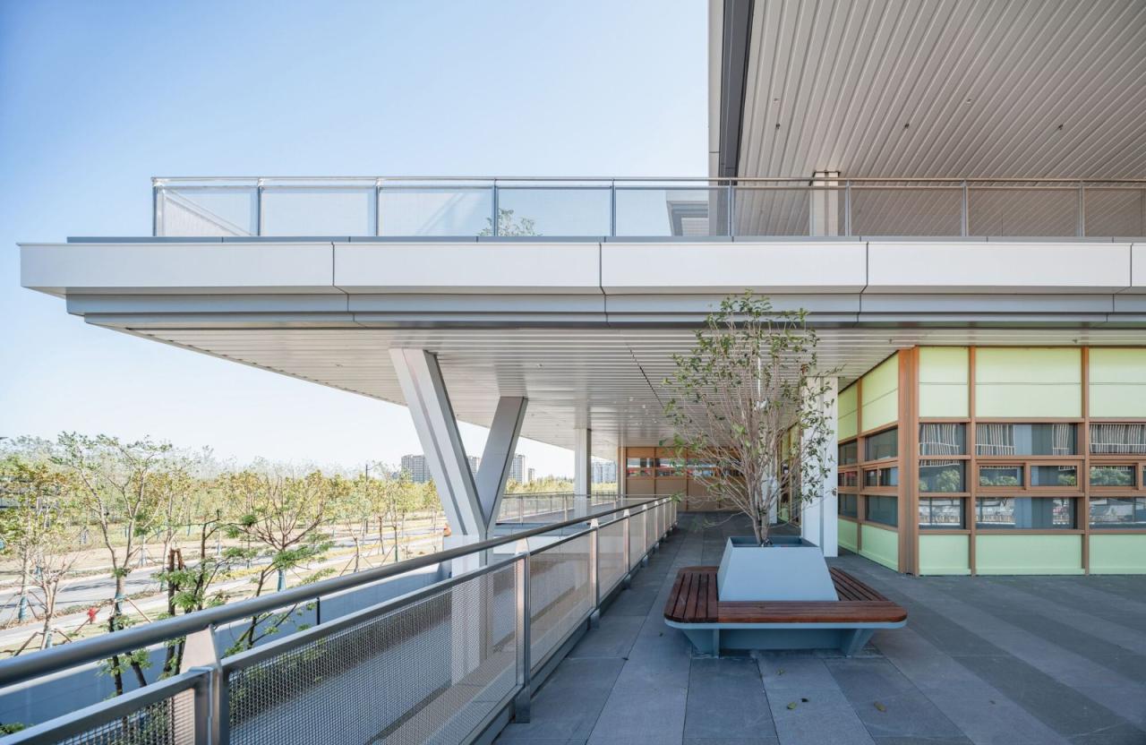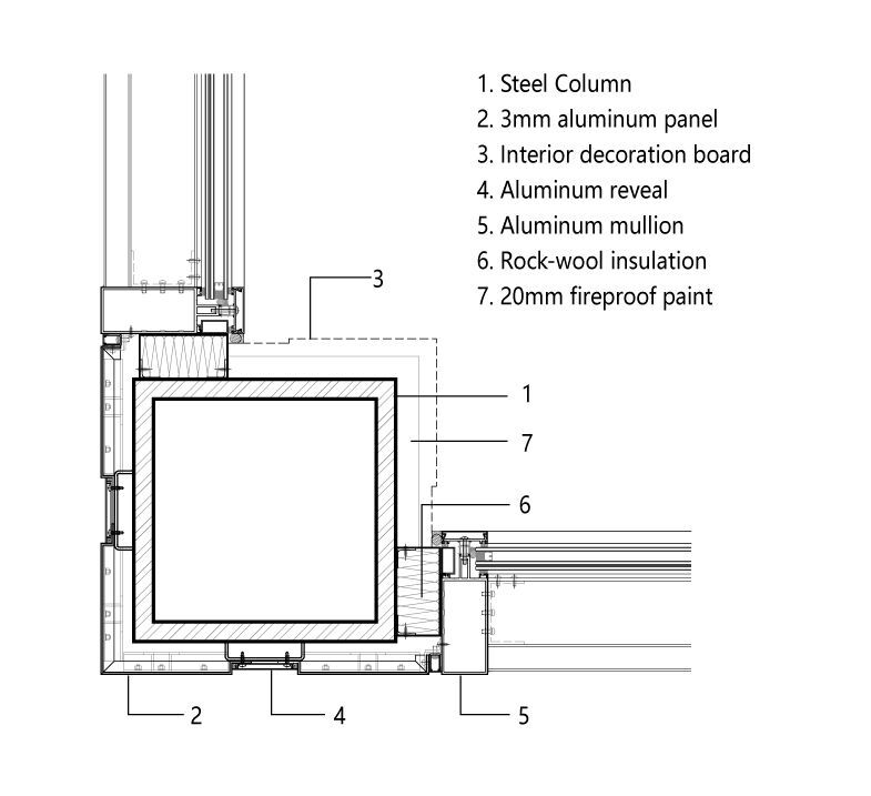 为满足公共建筑预制化率,建筑地上部分采用全钢框架结构。在8m见方、4.5-5.5m层高的标准柱网内,钢柱断面为400-500mm见方。为了提高室内教室和室外露台的空间使用效率,我们决定让大部分的盒体外墙与柱子平齐,并通过构造手段将墙体与柱子结合在一起。墙体上的单元窗框反置于室外,窗框表面与柱表平齐;与此同时,每根柱子在防锈与防火涂料外包的铝板饰面都拆分为四个转角,中间是内凹的深灰色铝板条缝。这样,一根柱子在立面上被拆分成左右两根,分别整合在两侧的窗框系统中,完成自身的消解。在室内,柱子在进深方向剩余大约450mm,根据室内使用的需要由窗边座位或窗台储藏柜消化——经过这样的构造设计,每个盒体的外圈都形成了约600mm的宽边,将柱、墙、窗和固定家具整合在一起,让内外两面的空间使用更加完整和便利。盒体上的门窗系统单元为2m宽、650mm高,通过较多的水平分割提供不同高度的开窗,以适应舞蹈、武术、器乐、合唱、美术、书法、智能技术等不同种类活动室的采光和通风需要。