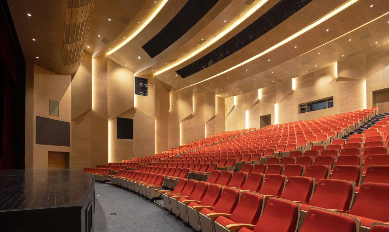 这些大尺度的平台不仅能跨越河道,更能通过架空释放大量底层空间,在图书馆和规划馆之间形成开放畅通的户外场所,成为整个文化街坊步行网络的中枢。我们最终运用这样的平台单元设计了两个套接的回字庭院,西侧的庭院在西南方向对接7号线锦绣路站地铁广场,主要容纳千人剧场和群艺馆;东侧的庭院为绿地环绕,主要容纳青少年活动中心。平台间的交叠和连接激发了不同区域和功能之间的交流互动。其中,青少年活动中心和群艺馆的平台单元在四层高的范围内纵横交错,构成了交叠错落的立体聚落,并提供了许多室内外的交流场所;跨河的花园平台则联系了严茂塘东西侧的两个大堂,成为公共动线的主干:西大堂包含了西入口门厅、地下展厅、大剧场前厅和花园平台西口;东大堂收纳了东入口门厅、咖啡厅、小剧场、青少年中心入口和花园门厅东口;花园平台桥上的走廊联系东西大堂,在河东中部向北连接群艺馆门厅,并通过电梯联系首层的餐厅和地下车库。