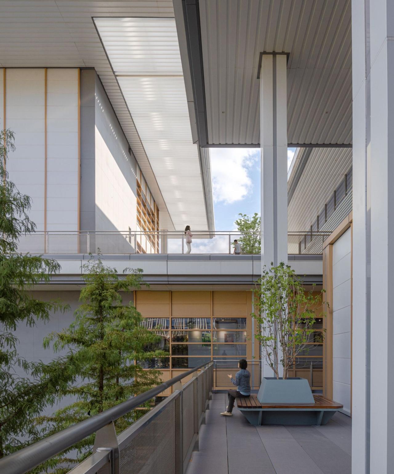 这个“哑铃”式空间用一桥联系东、西两个大堂,成为两馆共享的核心公共场所,也界定了两馆各自内部的运营范围。在两馆内部,做为活动空间的大小盒体在平面和剖面上没有对位,以营造松散自由的聚落氛围,而垂直交通、卫生间和设备用房则做为基本服务模块设置在回字的转角处,严格上下对位,以保证设备工程的逻辑和高效的可达性。大而整的平台回应集体的城市,小而散的盒体回应个体的身心,两者的结合不仅为馆内活动提供亲切活跃的场所,也通过与环境的交融使建筑成为城市生活的公共舞台。