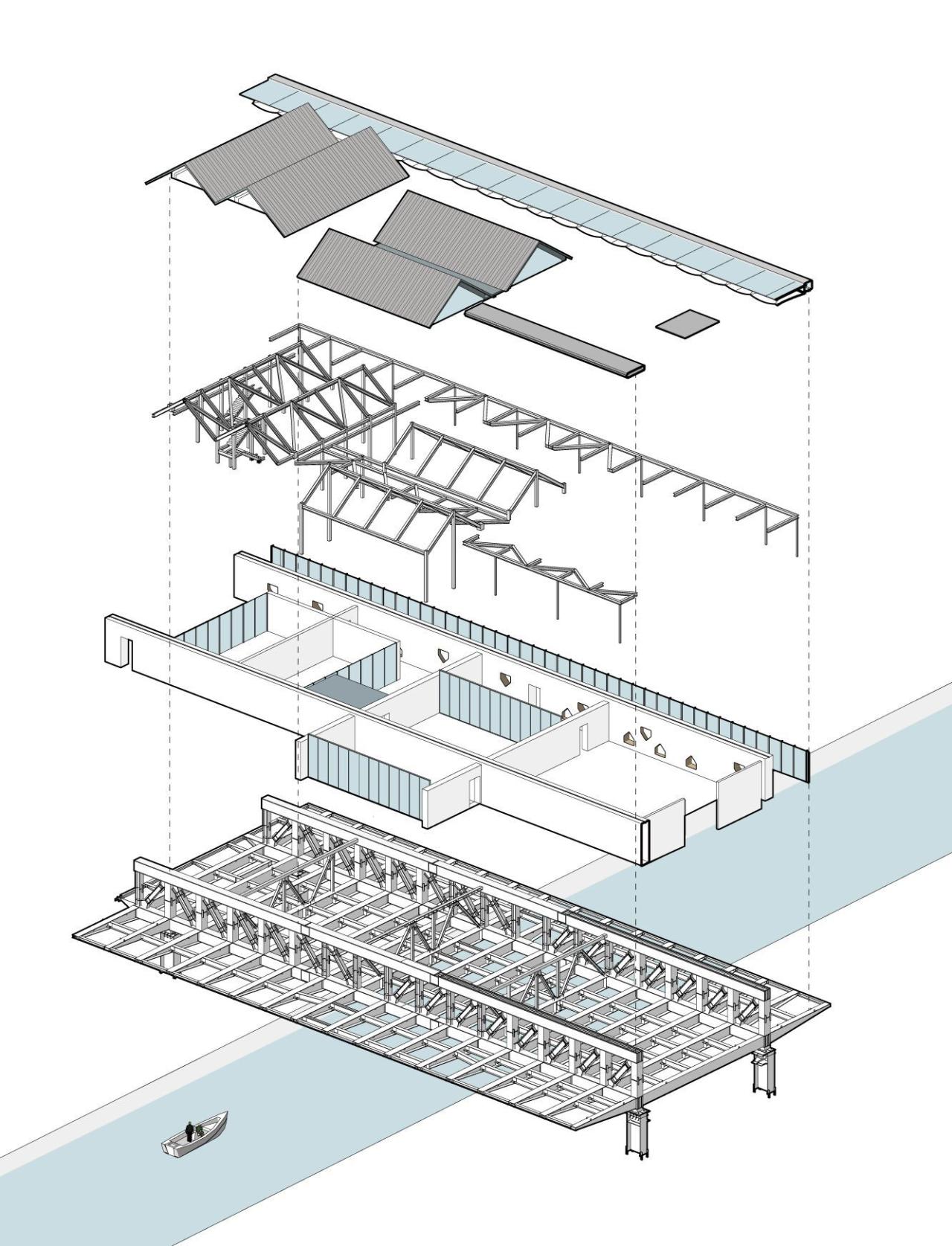在西侧的回字形庭院,两道东西向的连桥平台都采用桁架结构跨越河流。位于三层的北连桥桁架露明,主要用于通行;位于二层的南连桥则是一个特殊的跨河平台,我们将桥梁结构和庭院空间结合起来,藏桁架于墙中,营造出一个由屋院和绿植构成的庭院聚落,成为河上通行、休憩和活动的复合场所。整个桁架系统跨度60米,由两道东西向的主桁架和四道南北向的联系桁架构成。经过与结构师的密切合作,我们利用每品桁架中部的空腹部分,以及直、斜腹杆之间的空隙设置院墙上的门洞和窗洞,并用桁架墙支撑上部的坡屋顶结构,形成散布院内的小屋。于是在直行通道南侧的庭院中,我们营造出一处可绕行、可停留的平行时空。