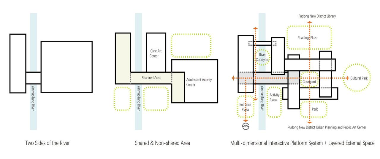 2015年,浦东新区计划新建一座活动中心,容纳一同搬迁来的区青少年活动中心和群众艺术馆,选址在锦绣路东侧的绿地中,在规划上与北侧现有的浦东图书馆(株式会社日本设计Nihon Sekkei)和南侧待建的浦东城市规划和公共艺术中心(David Chipperfield Architects)一起构成浦东新区的“文化街坊”。 青少年活动中心和群众艺术馆虽然分别隶属教育局和文广局两个机构,但新区政府前瞻性地考虑到两者相近的城市功能和运行机制,决定将两馆整合在一个建筑群中,为未来的资源共享、配置调整和可持续发展提供更加灵活的空间结构。在为项目举行的国际设计竞赛中,山水秀建筑事务所获得第一名,并与同济大学建筑设计研究院联合得到了整个项目的设计委托。