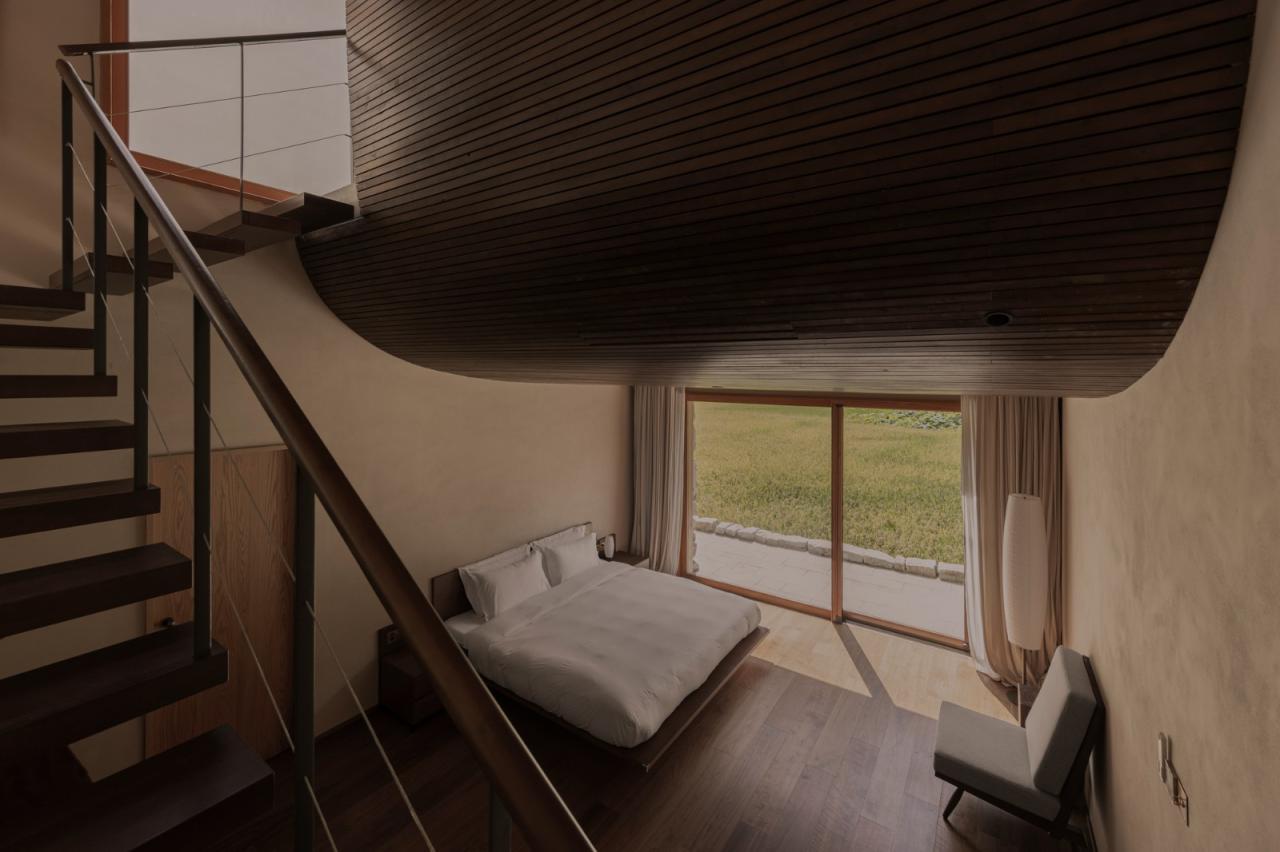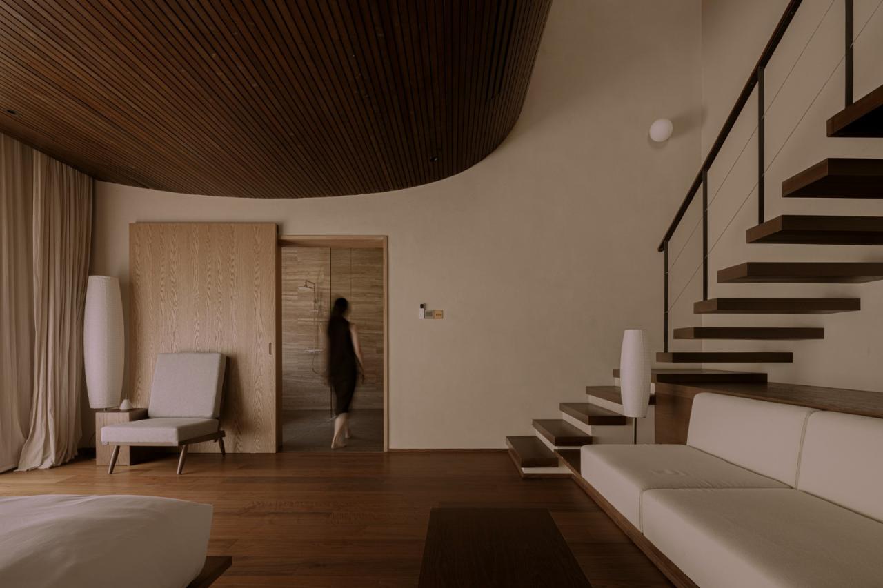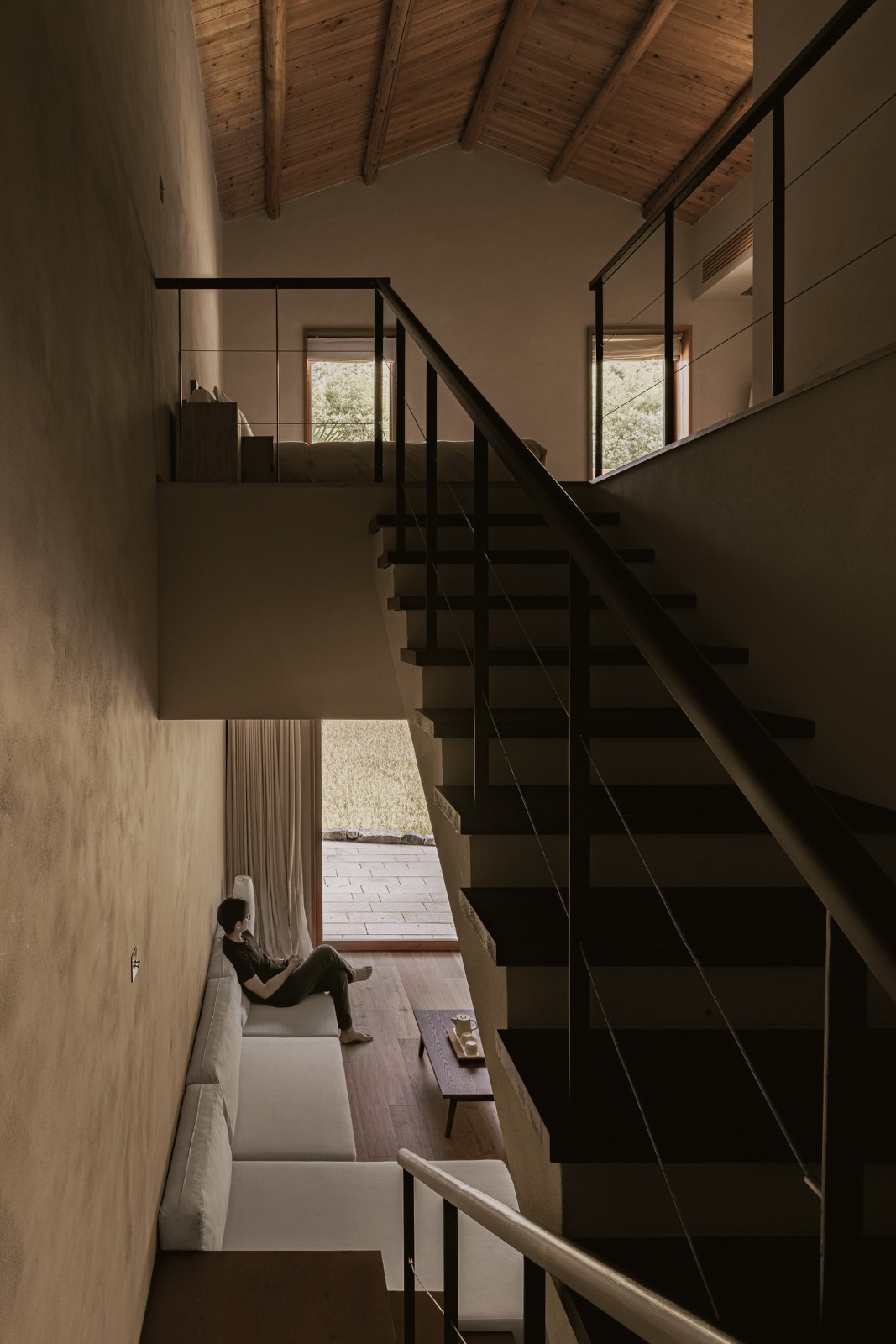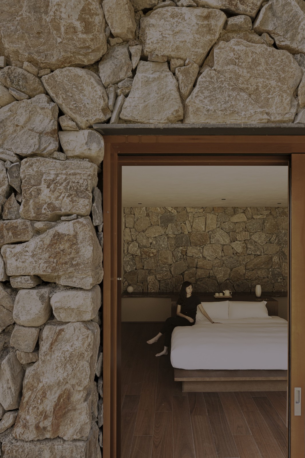 此外,客房内部,卧室等私密性要求较高的功能,设置在由石墙包裹内的一层,同时面向梯田。让客人享受舒适入住的同时,还能体验到丰富的外部环境。