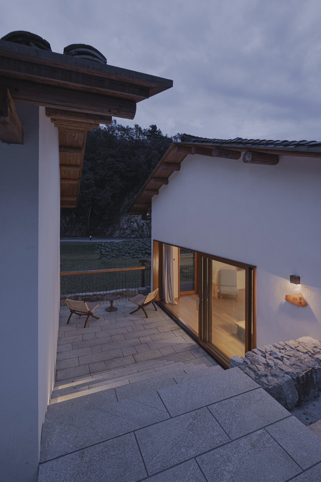 二楼的露台和屋顶构架,与当地建筑类似,椽子均由原木制成,即使是一座新建筑,也能够让建筑融入到原有的村落中。