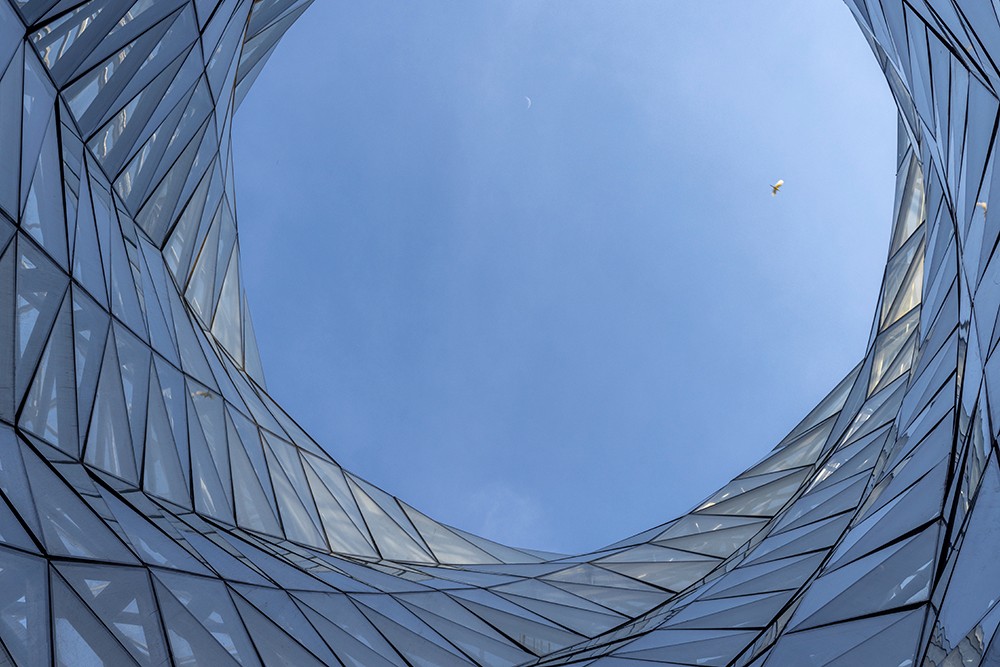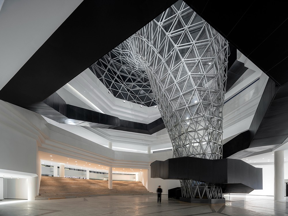 这座不断旋转的云馆仿佛是在江南土地上的一个八卦漩涡,强而有力的改变了整个开发区,机械且单调的气氛。充满人性尺度的户外天桥引领人们通往建筑,讓人们与周围的环境,建立更友善的关系。