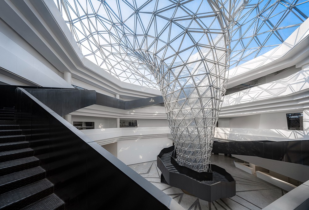中央主中庭,由中空的玻璃结构体由外而内贯穿, 表面上可供开合的玻璃窗兼具着通风与采光的功能。黑色旋转钢板楼梯以中央结构体支撑,连接一至三层楼面,每个楼面延续八卦的形态,切分成一层层的切面迎向天空。天光顺阶洒下充满整个中庭,时刻透露出的光影变化, 映射着下方的黑白拼花的水磨石、白墙与木阶梯,共同打造极具仪式感的天地剧场,外部刚硬的形象与内部温暖的光线,演绎着刚柔并济的东方建筑,建筑内部与外部环境融为一体。