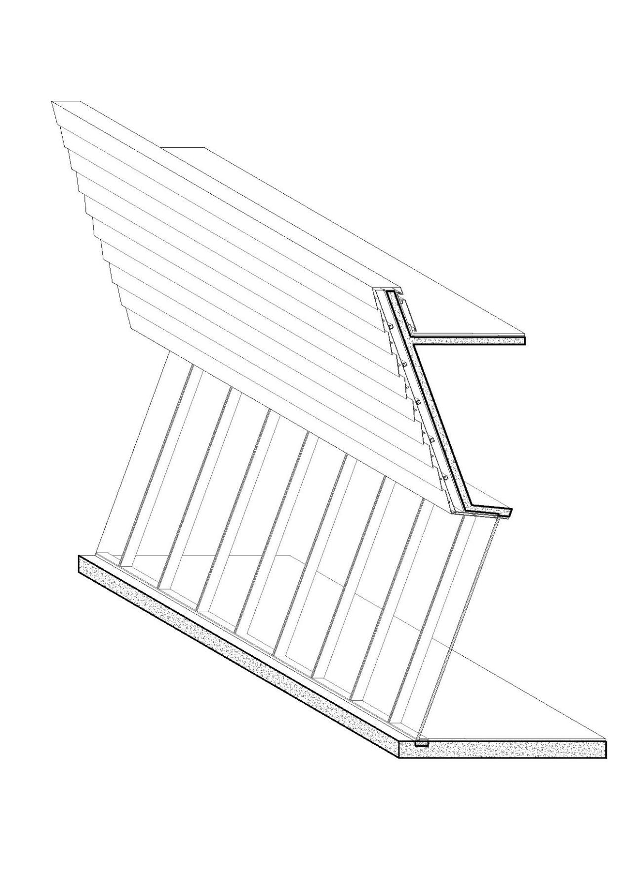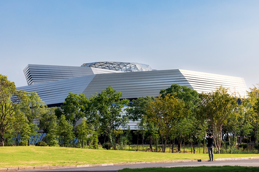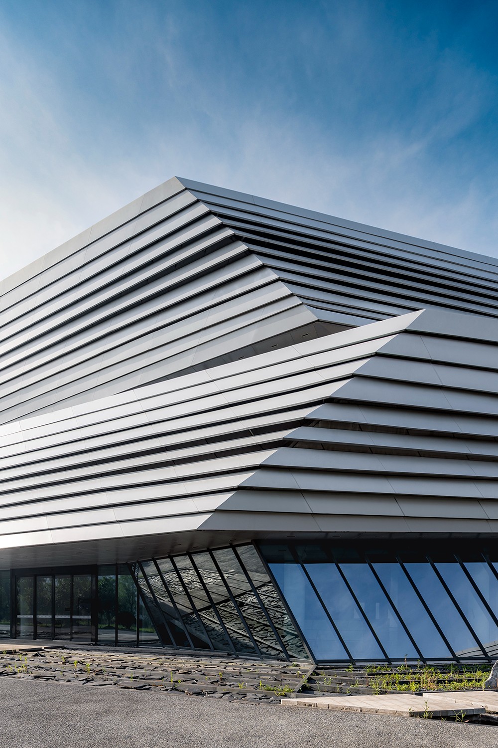 建筑整体外观为转动的金属表皮,是由企业自主研发生产的铝板,预制切割弯折并自主施工,体现中国制造精工细做的文化。每一片折面上有着连续不断凹折线,形成的光影变化体现出灵动的艺术感受。户外花钢岩地面构成往上盘旋的通道,地面与外墙两者间形成缝隙,可以由外部引入漫射的光线,与建筑内部相连,创造展厅舒适参观体验。