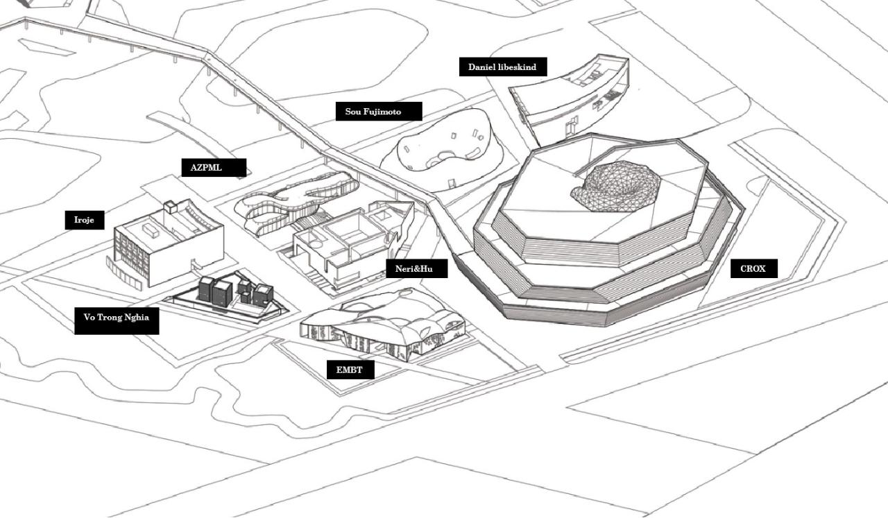 设计聚落由林琮然(中国台灣)协同七家国际知名的建筑设计事务所包括:里伯斯金(美国),娜德塔·塔格利亚布(西班牙),藤本壮介(日本),亚历杭德罗.札拉波罗(西班牙),承孝相(韩国),武重义(越南)郭锡恩和胡如珊(中国上海)等9位国际著名的建筑师共同打造。